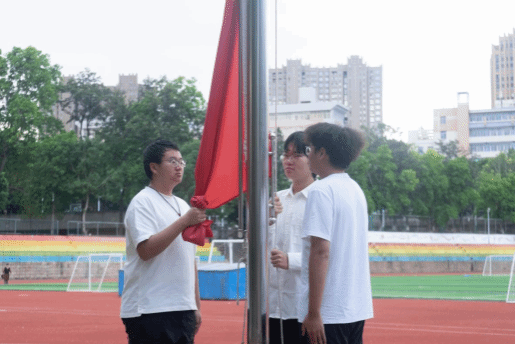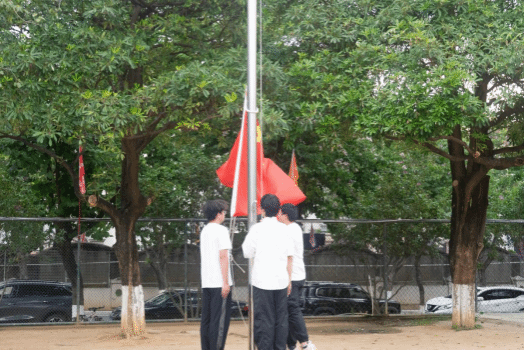 沐浴着晨曦的微光,升旗仪式正式开始。伴随着庄严的国歌,鲜红的五星红旗冉冉升起。全体师生面向国旗行注目礼,高唱国歌,以肃穆的姿态向国旗致敬。