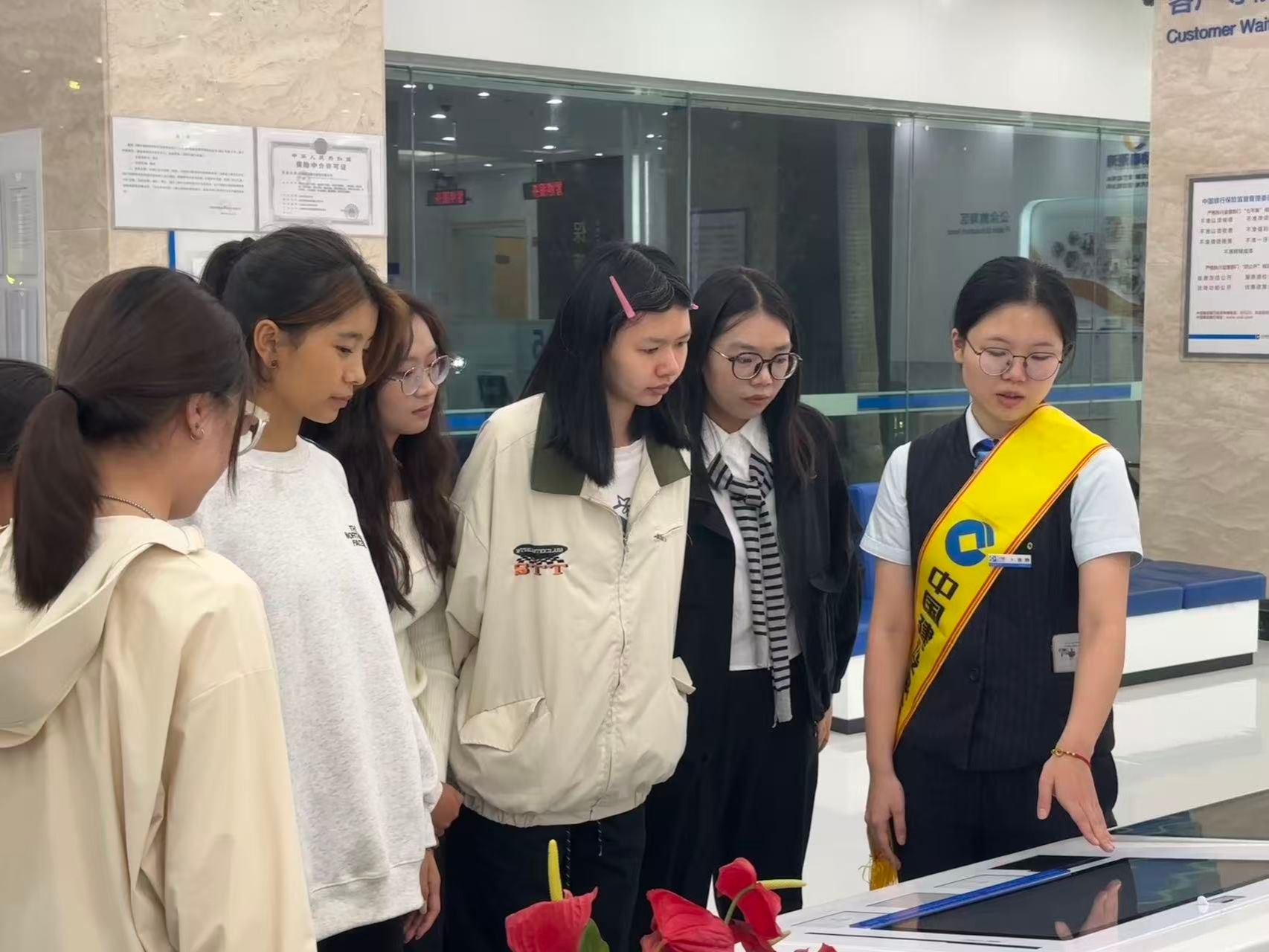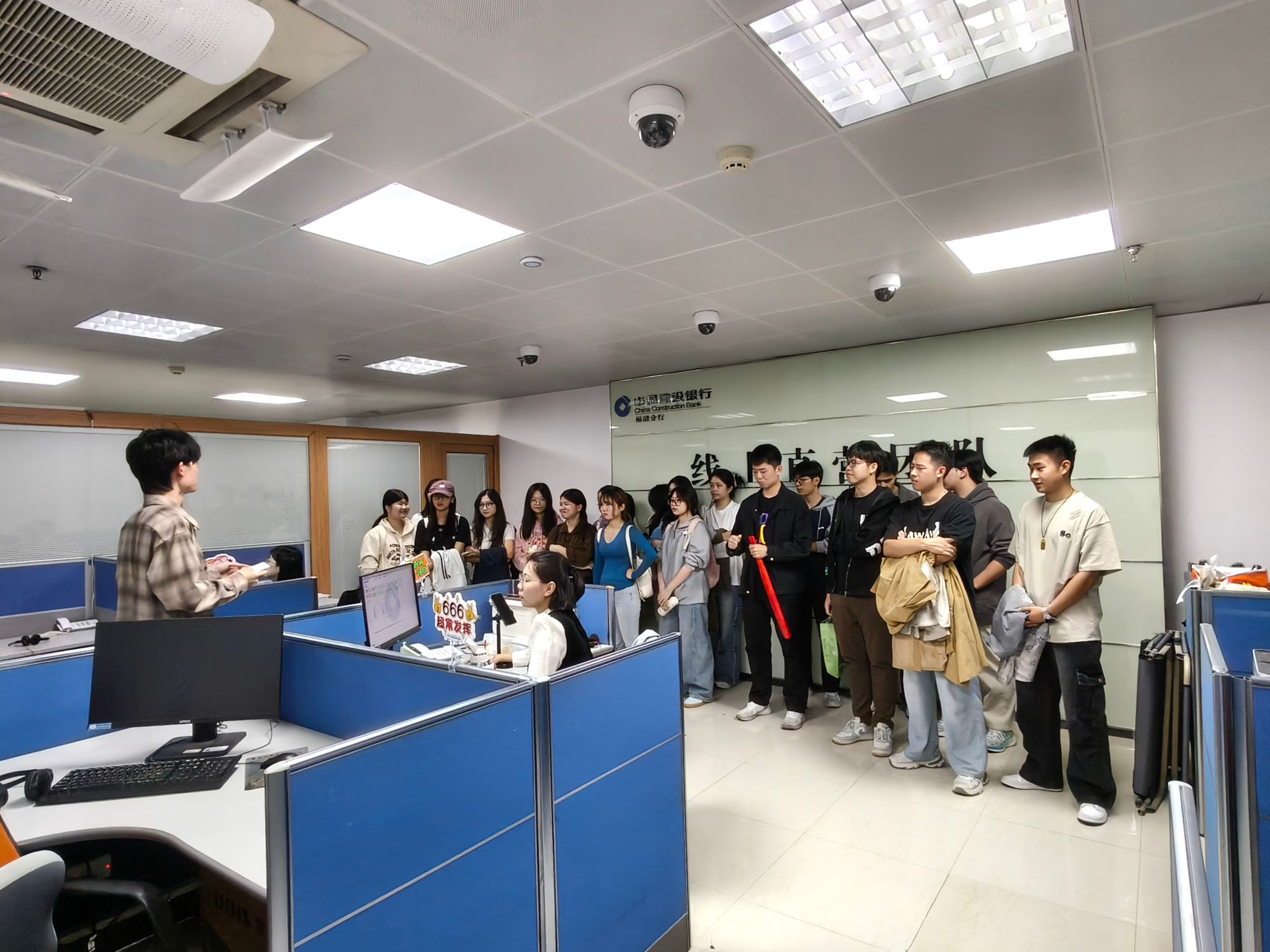 建行工作人员带领同学们参观了建行现代化办公区与营业大厅,系统介绍了银行各岗位职责与能力要求,直观展示了银行的日常运营、部门职能。