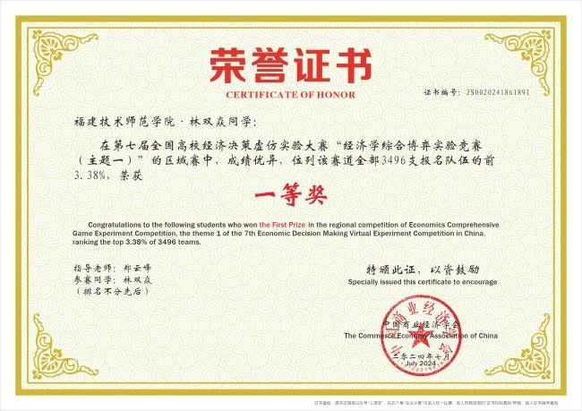 经过长达4个月的激烈角逐,我院行政负责人郑云峰指导的2021级经济与金融专业林双焱同学凭借前3.38%的优异成绩荣获一等奖,成功晋级全国总决赛。