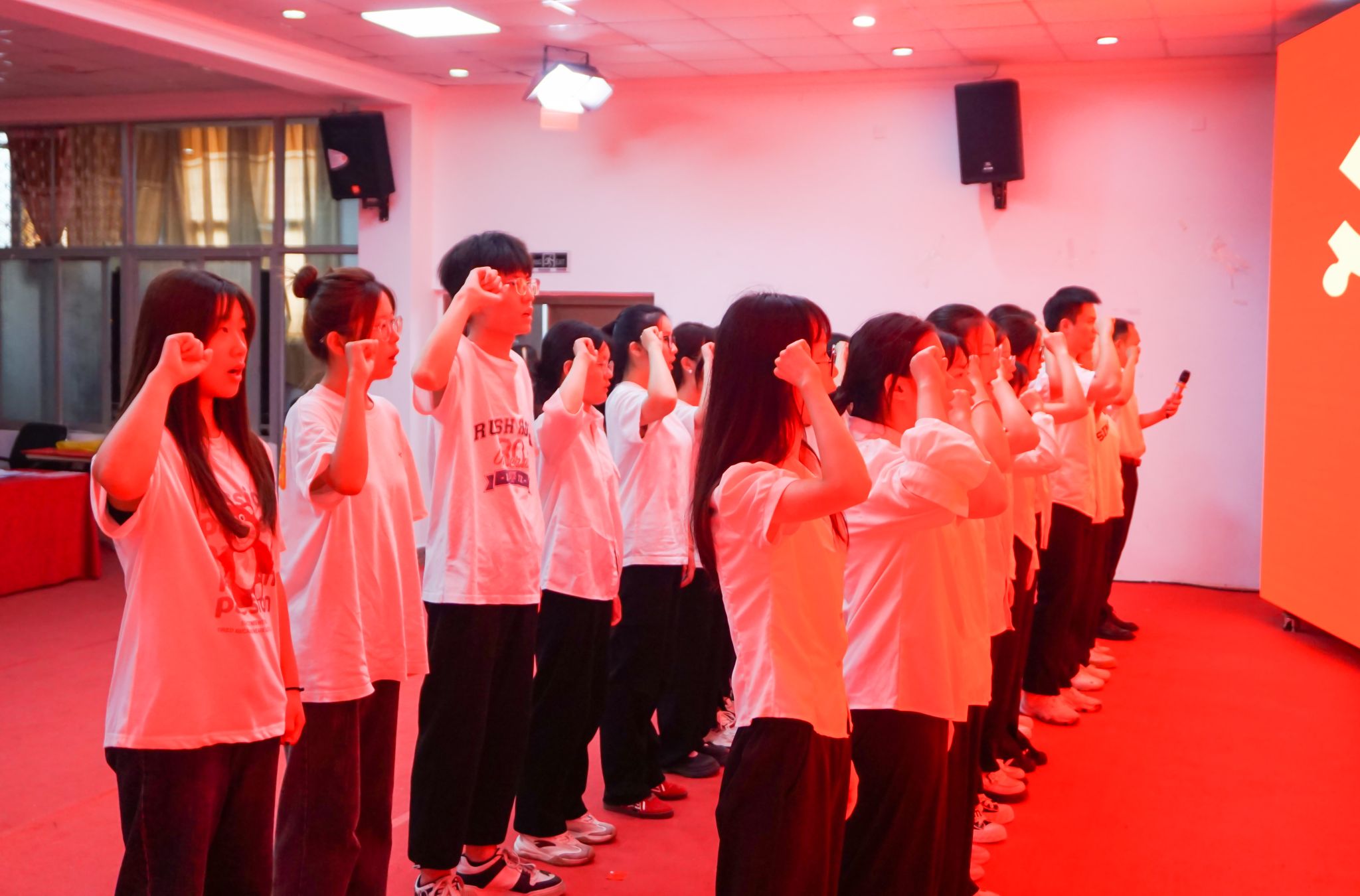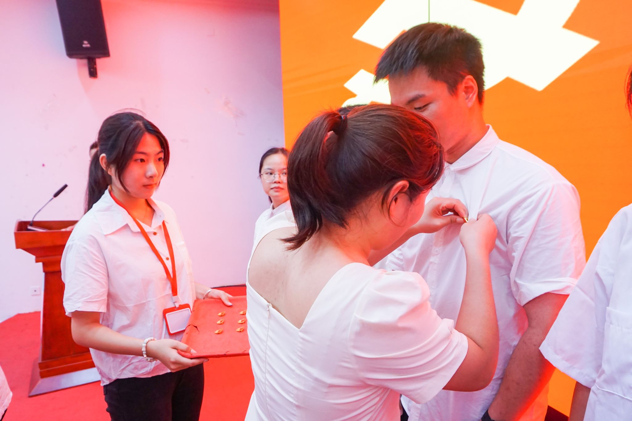 面对鲜红的党旗,学院党委副书记、纪委书记肖曦进行了领誓,全院师生党员高举右拳,进行了庄严宣誓。宣誓后,学院学生第二党支部书记、2021级辅导员张静瑶同志,学院学生第七党支部副书记、2023级专升本辅导员王亚苹同志为2024年学院上半年新发展的24名学生党员佩戴了党员徽章。