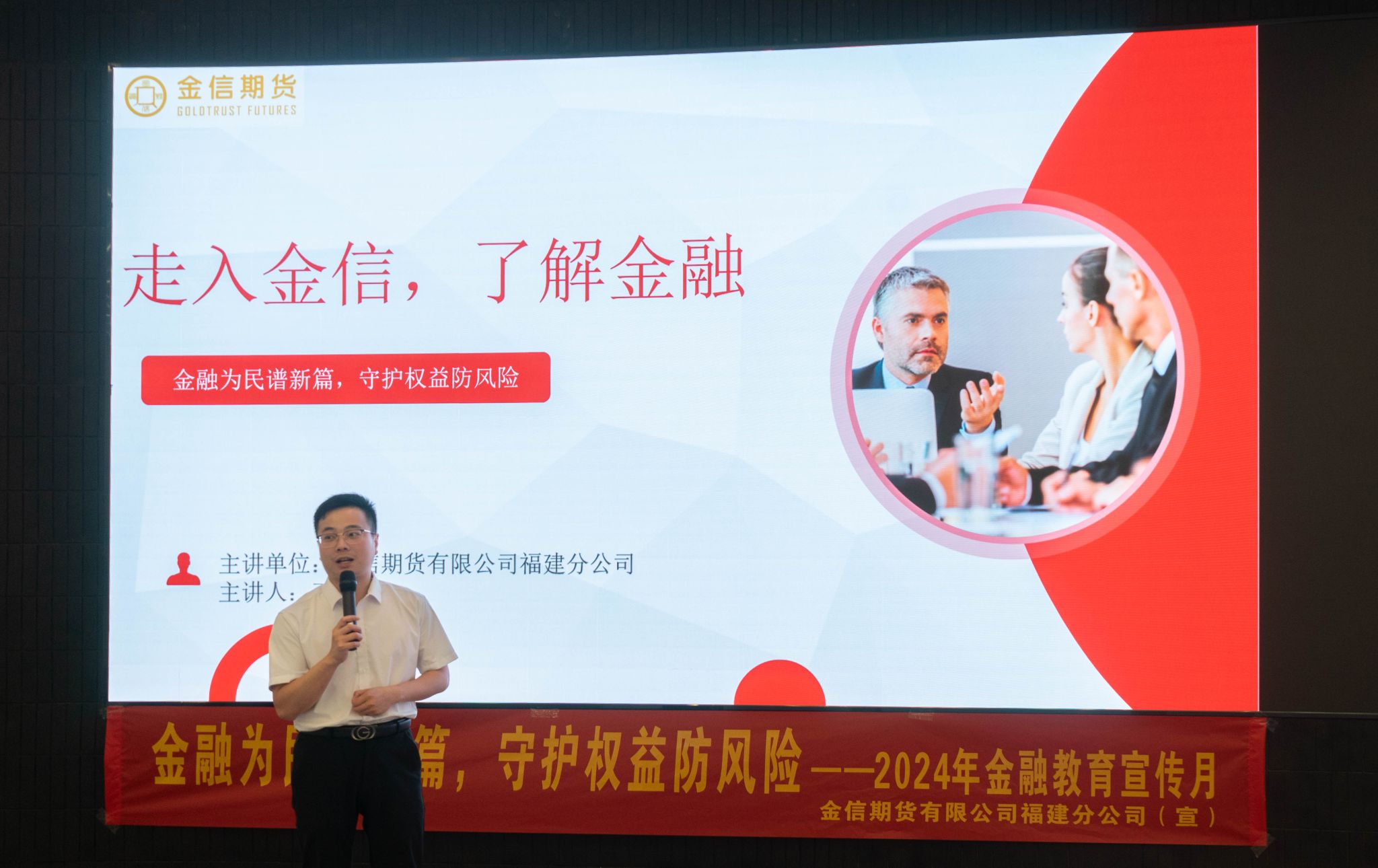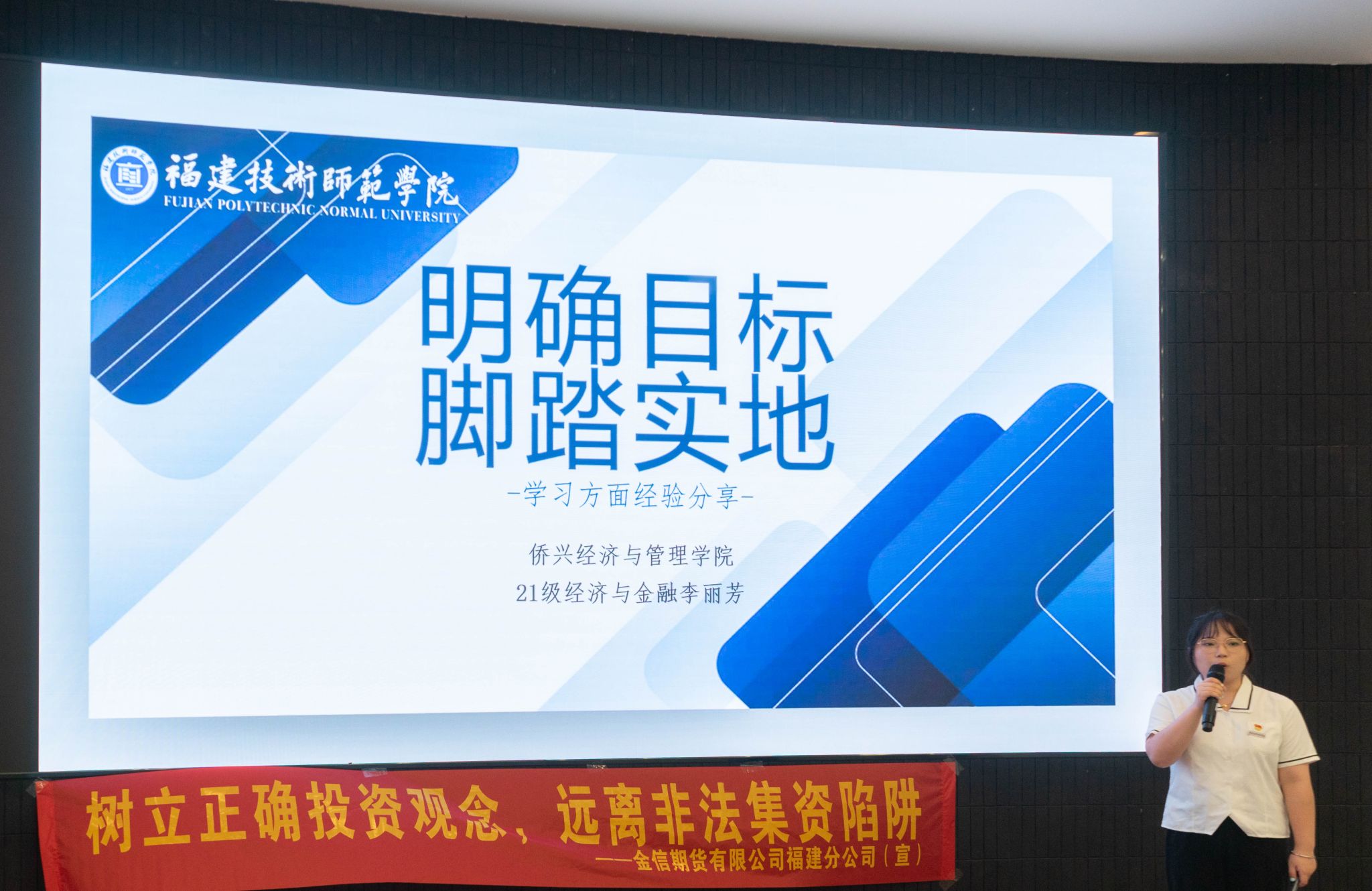 随后,金信期货有限公司福建分公司总经理、我院2016届优秀校友王金钟围绕着个人职业发展经历,就金融行业发展作了分享。