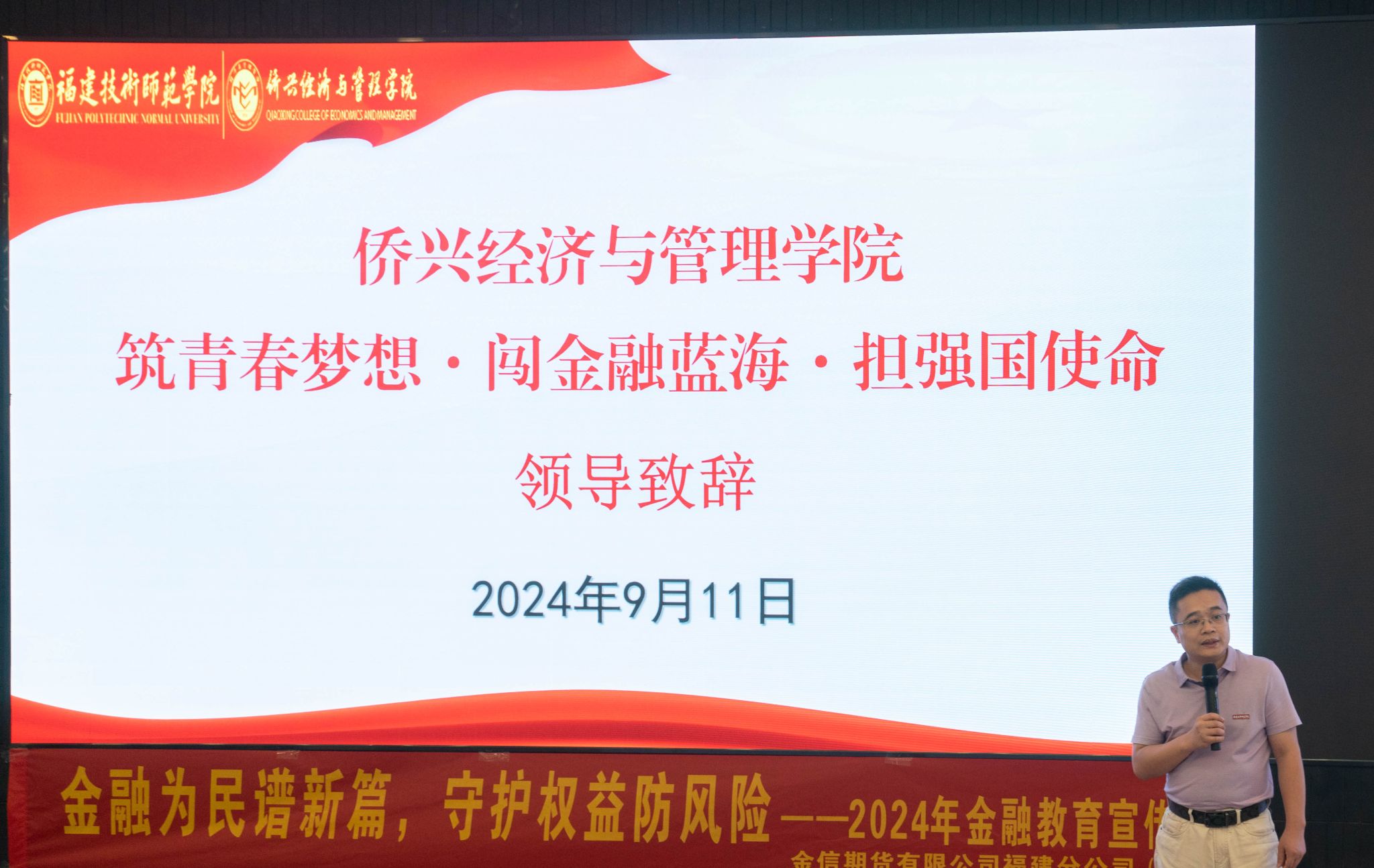 本次入学教育以“筑青春梦想·闯金融蓝海·担强国使命”为主题,得到了金信期货福建分公司、山西证券福清营业部等企业的大力支持。活动中,行政负责人郑云峰介绍学院发展历史、人才培养定位,勉励青年大学生珍惜青春时光、学好专业知识,敢于担当金融强国使命。
