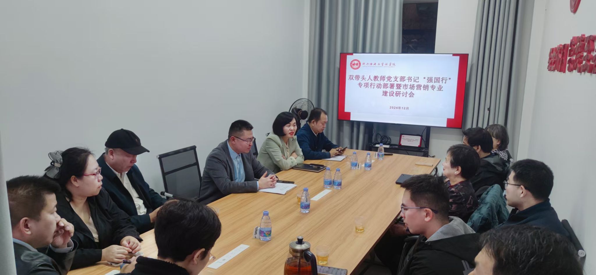 12月4日下午,学院党委在鹿鸣楼213召开“双带头人”教师党支部书记“强国行”专项行动部署暨市场营销专业建设研讨会。学院党委副书记(主持工作)林伟、副院长(主持工作)魏秀华、党委副书记肖曦、党委委员黄颖秋以及市场营销专业全体教师参加了会议。