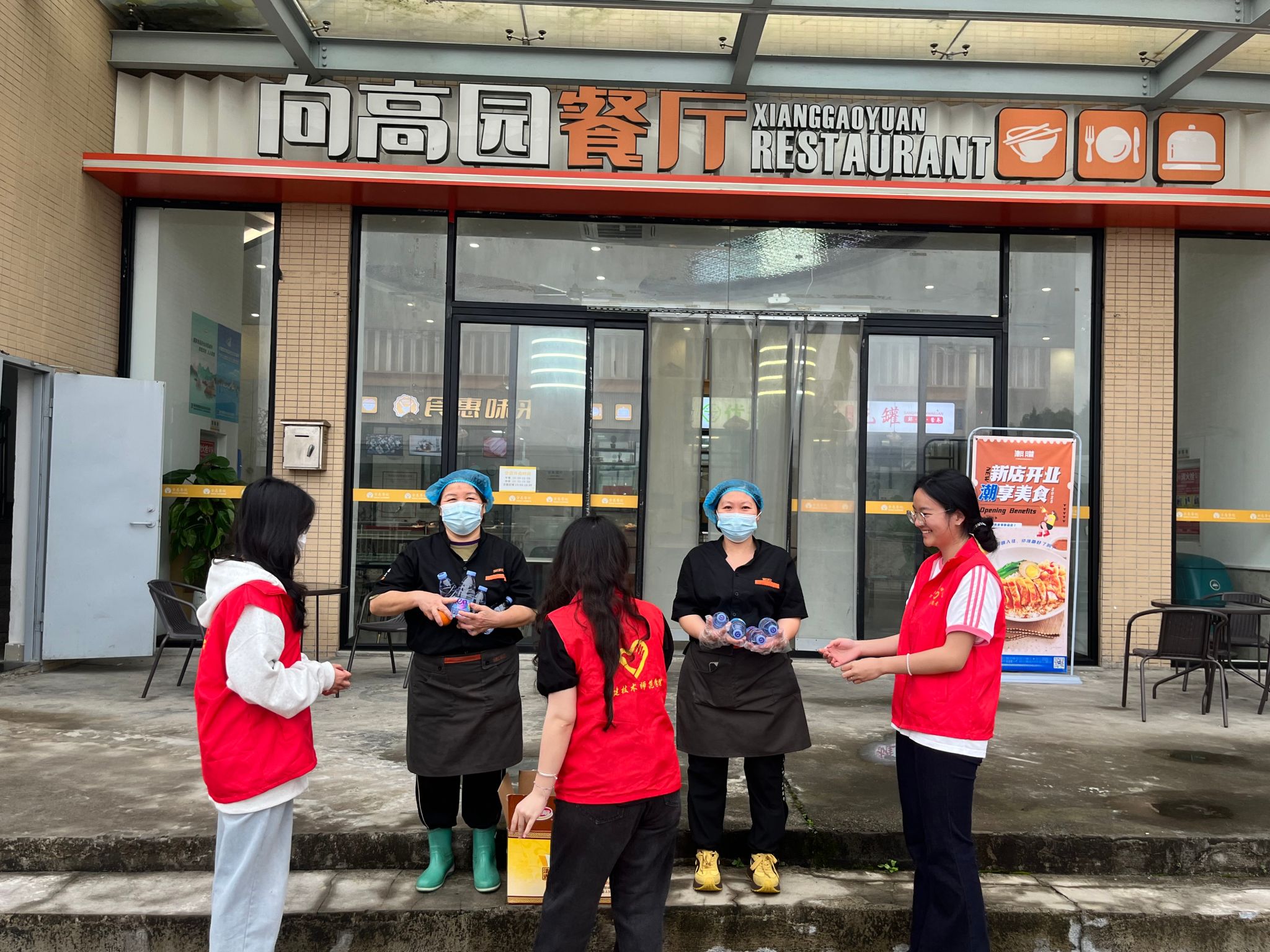 在龙江街道南门社区,青年志愿者同基层社区工作者进行了互动,为社区一线工作者、保安、河道环卫工人送上水、面包,向他们致以崇高的敬意!