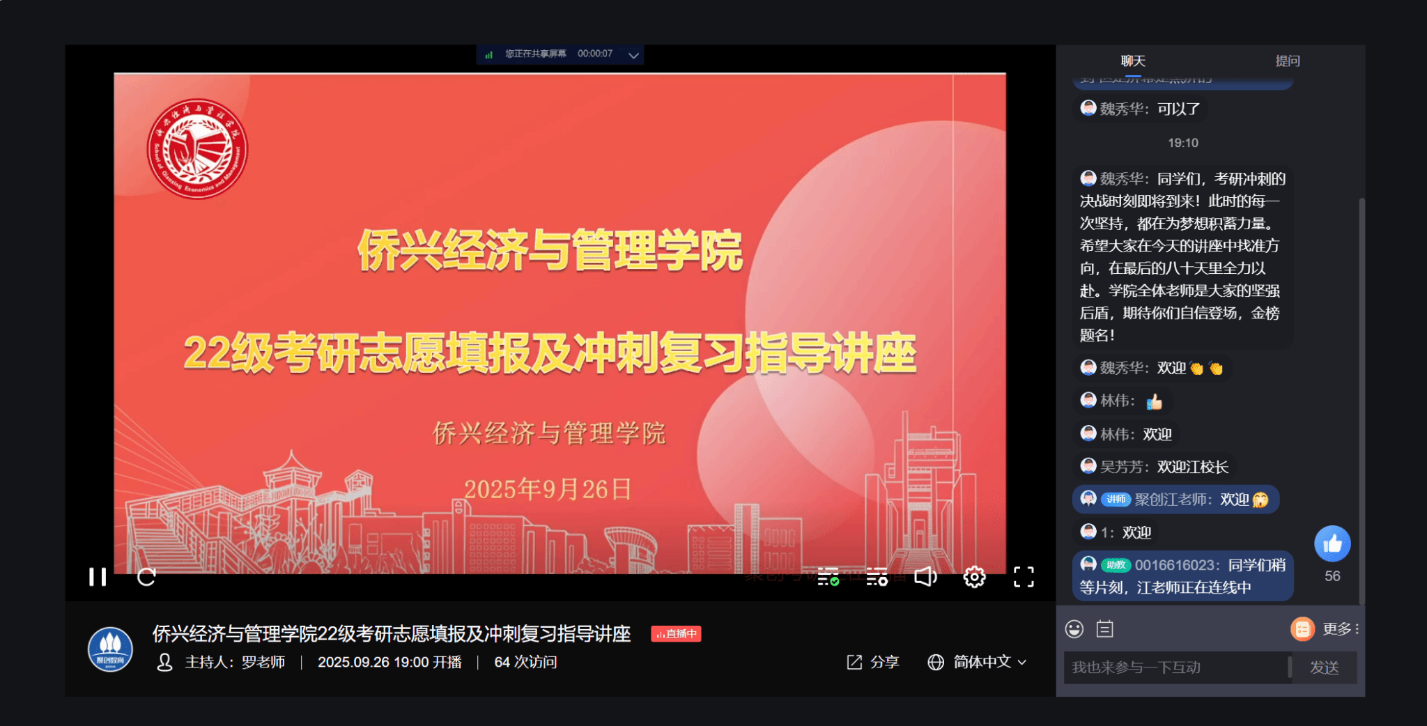 9月26日晚,学院举办2026届毕业生考研志愿填报及冲刺复习辅导讲座。院党委副书记(主持工作)林伟、院长魏秀华、院党委副书记肖曦、2022级辅导员吴芳芳、2024级专升本辅导员蔡俊航及2026届意向参加研考同学参加了活动。