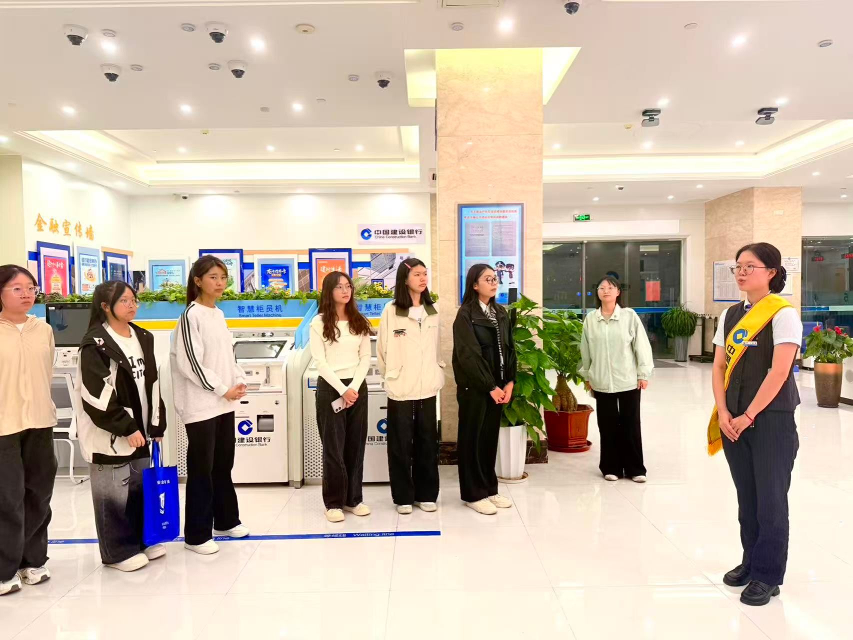 建行工作人员带领同学们参观了建行现代化办公区与营业大厅,系统介绍了银行各岗位职责与能力要求,直观展示了银行的日常运营、部门职能。