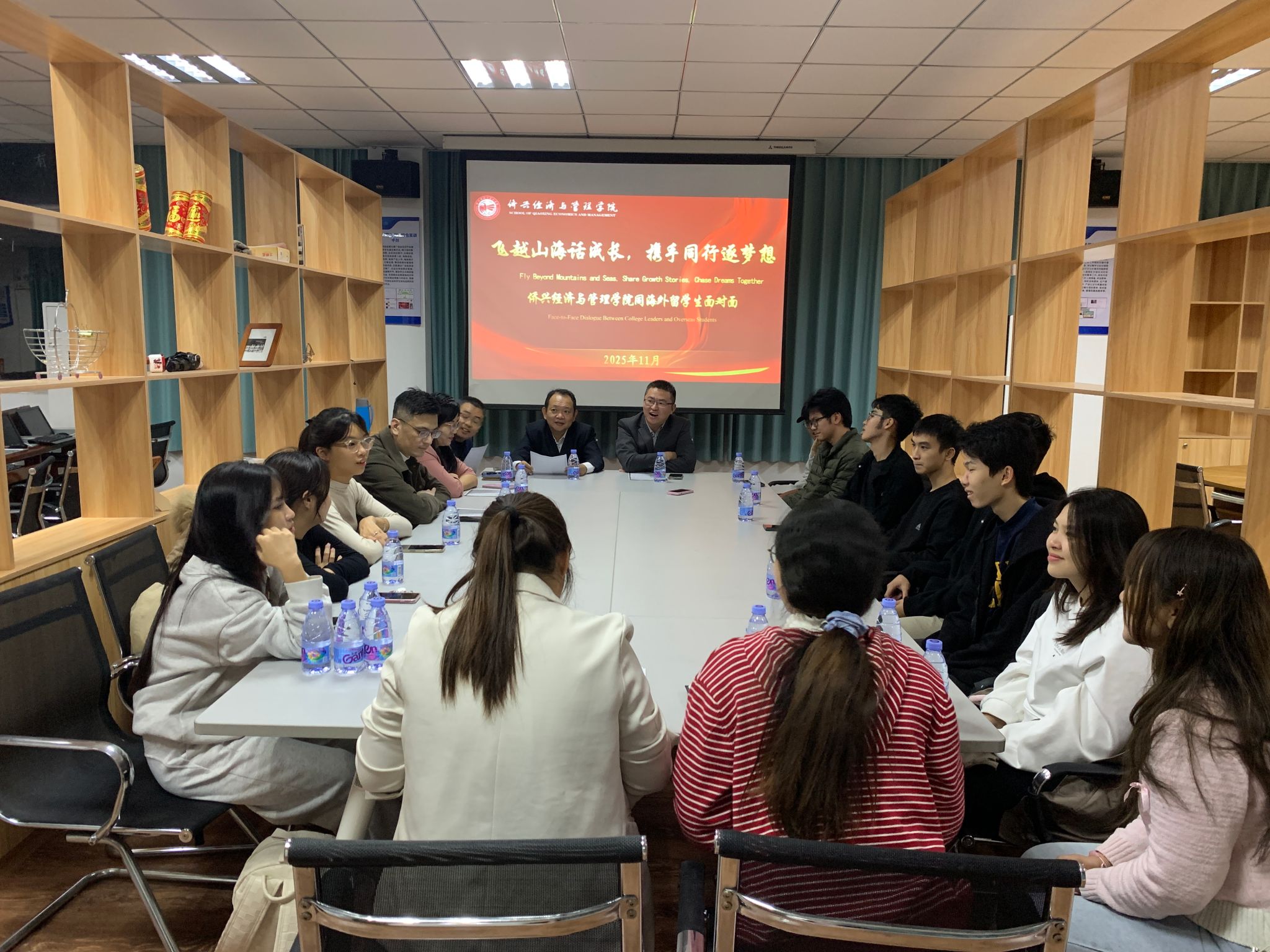 11月11日晚,学院以“飞越山海话成长,携手同行逐梦想”为主题,在科学楼403举办与2025级海外留学生“面对面”活动。学院党委副书记(主持工作)林伟、党委副书记肖曦、国际经济与贸易专业主任赵桂燕、经济与金融专业主任蒋波、市场营销专业主任李国栋以及2025级本科辅导员王亚苹、海外留学生辅导员卢婷参加了活动。