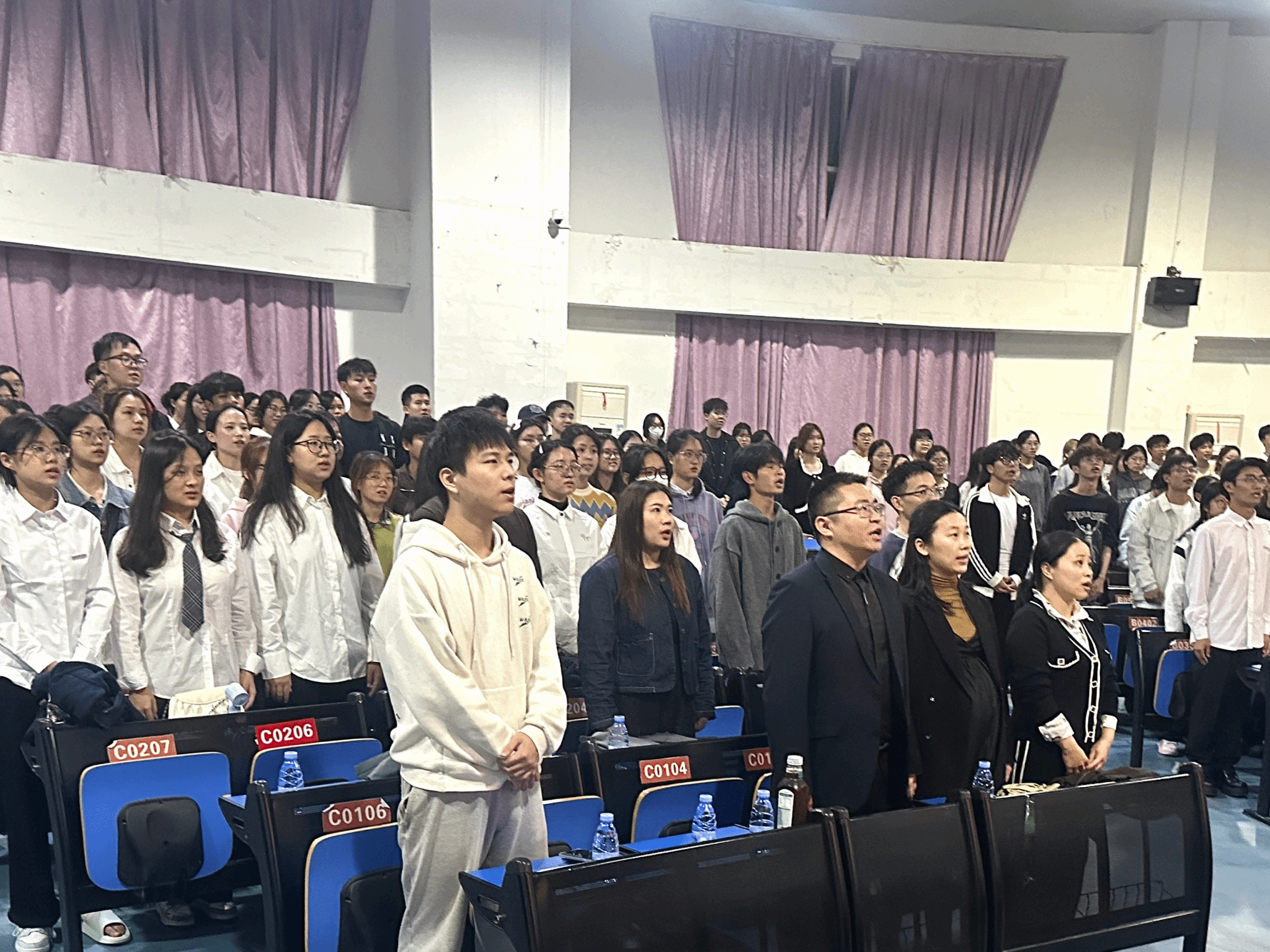 仪式伊始,现场响起了雄壮的《义勇军进行曲》。在场师生全体起立,高唱国歌。