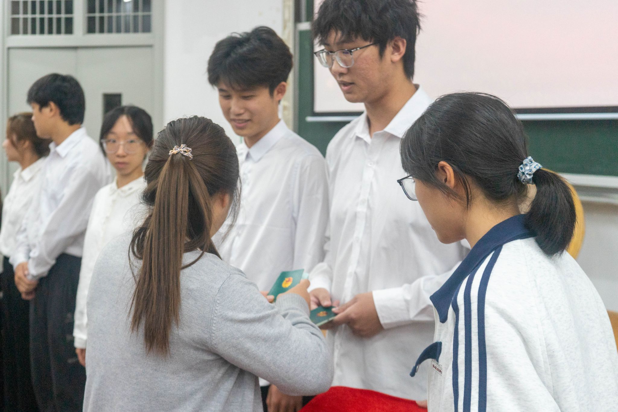 2023级市场营销专业蔡坤煌作为领誓人,带领新入团团员们面向鲜艳的共青团团旗,高举右拳,庄严宣誓。学院团委副书记李薇、2025级本科辅导员王亚苹为新团员代表佩戴团徽徽章,并颁发团员证。