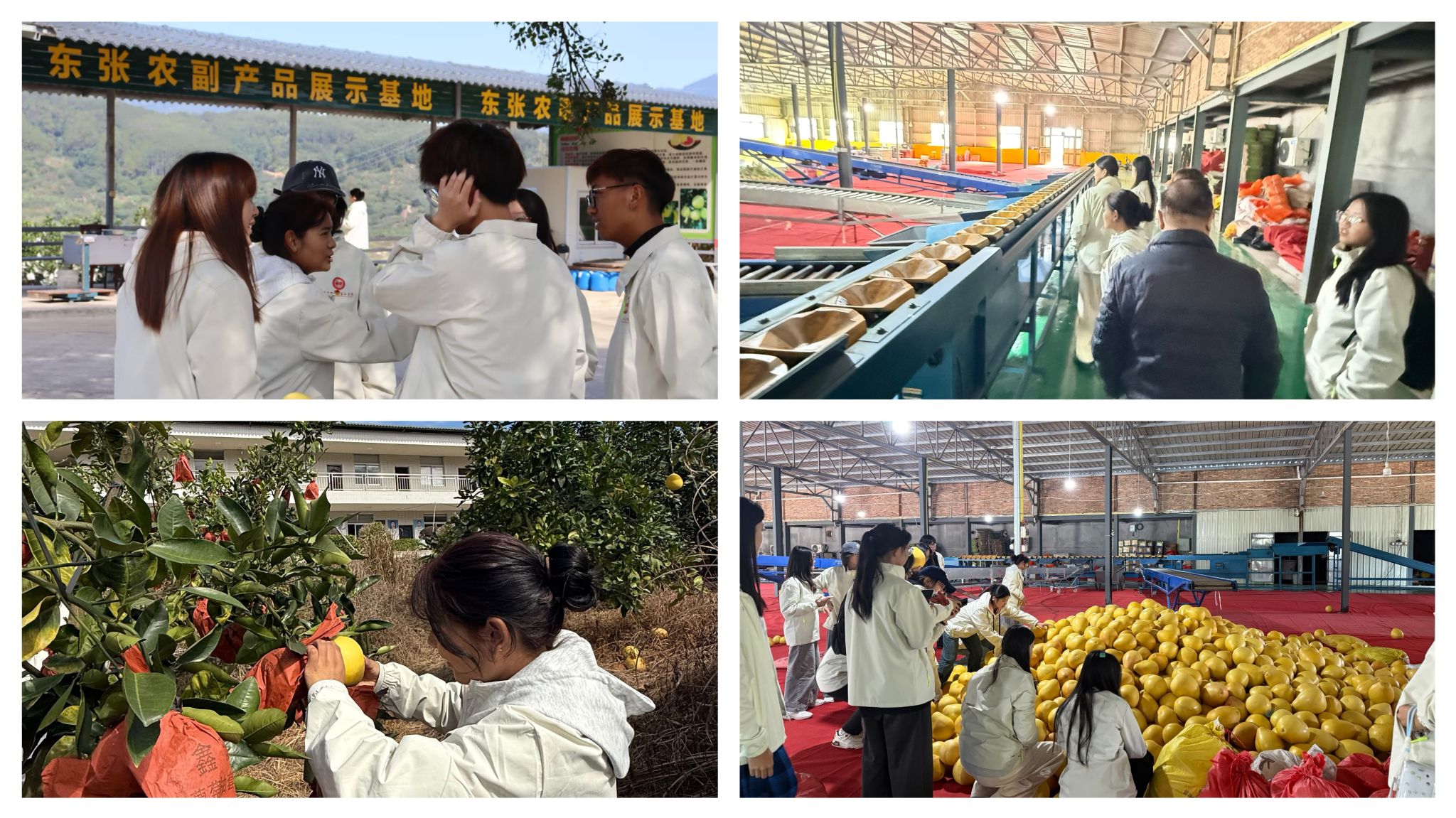 20日上午,专业部分成员前往福清市惠煌农业开发有限公司柚子园,实地探访柚子种植、分拣、包装全产业链。在果园负责人的带领下,同学们深入了解红心蜜柚的品种特性、种植管护技术,亲手体验采摘流程;在分拣车间,大家观察自动化分选设备运作,学习农产品标准化分级与品牌包装技巧。