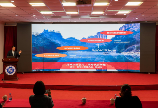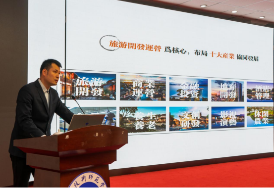 他以“闽越水镇”全域旅游项目为例,从历史文化、交通规划、景区选址、旅游活动等方面全方位介绍了“闽越水镇”旅游项目,为同学们展示“闽越水镇”项目致力于打造福州首个“一站式”旅游集散地的远景规划。
