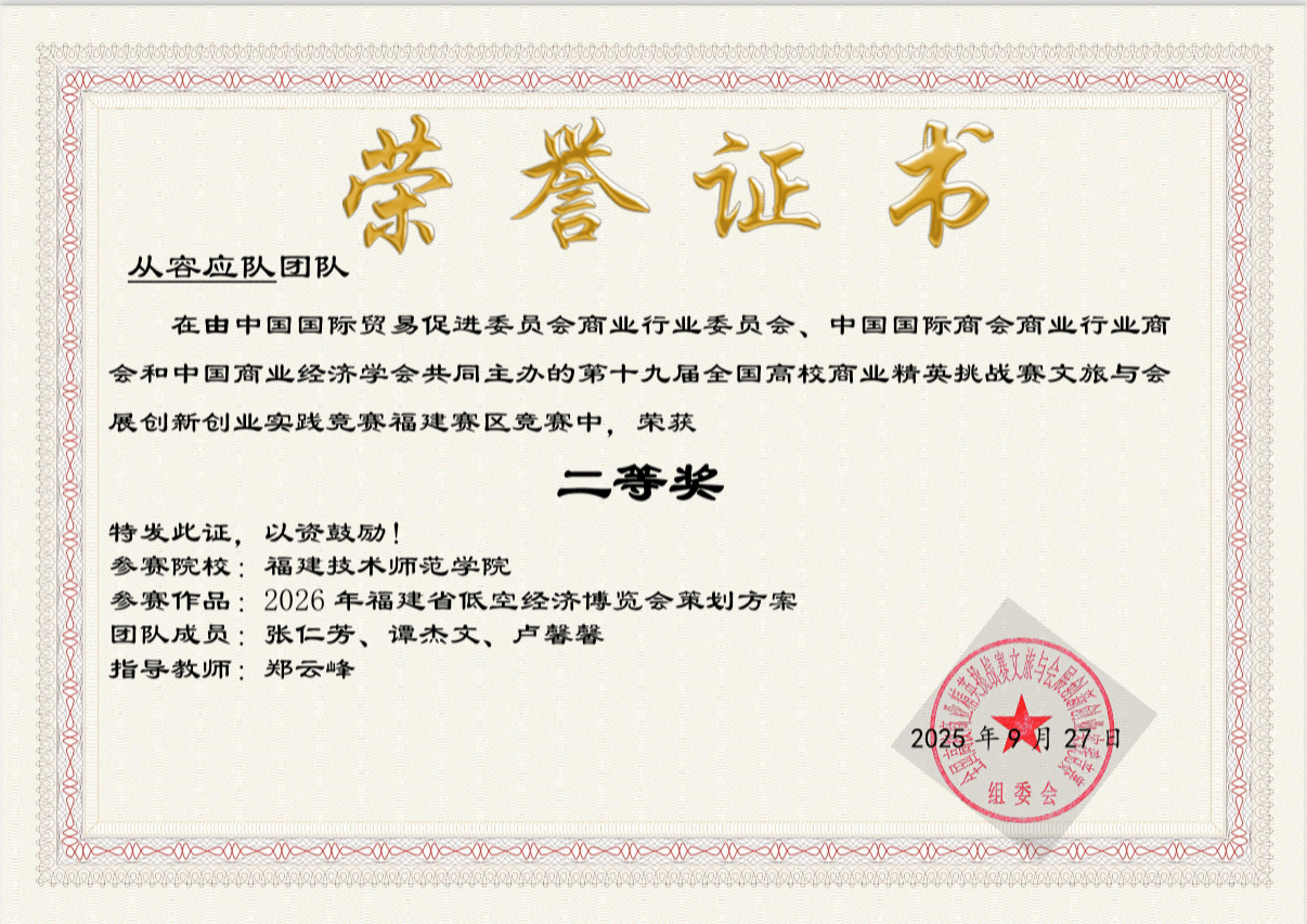 2023级财务管理专业张仁芳、2023级市场营销专业谭杰文、2024级财务管理专业卢馨馨组成的“从容应队”,参赛作品《2026年福建省低空经济博览会策划方案》获二等奖,指导老师为郑云峰。