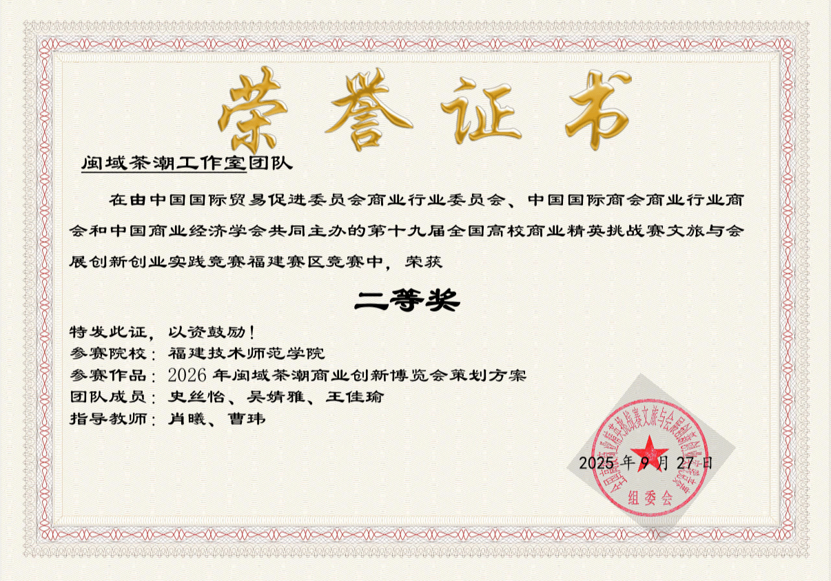 2023级市场营销专业史丝怡、2023级国际经济与贸易专业吴婧雅、2023级财务管理专业王佳瑜组成的“闽域茶潮工作室”,参赛作品《2026年闽域茶潮商业创新博览会策划方案》获二等奖,指导老师为肖曦、曹玮。