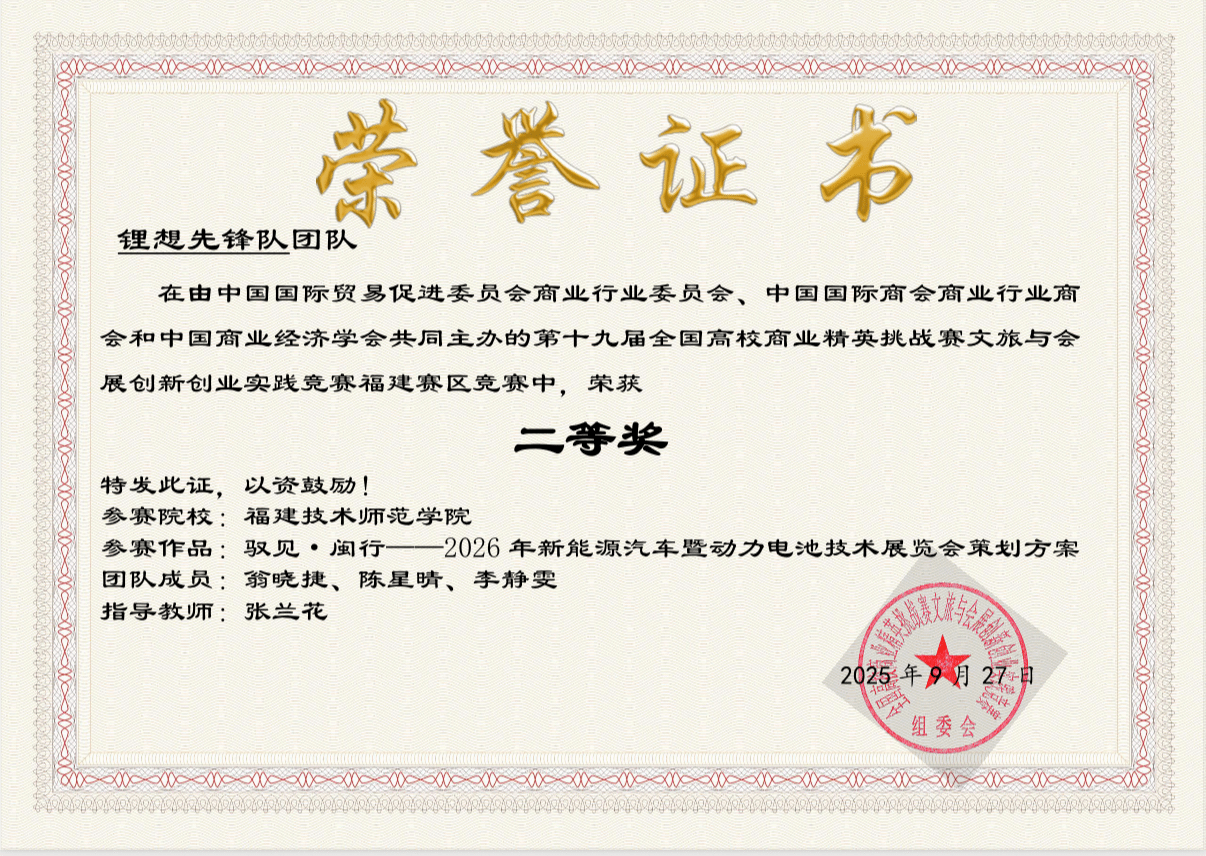 2024级经济与金融专业翁晓捷、2024级经济与金融专业陈星晴、2024级经济与金融专业李静雯组成的“锂想先锋队”,参赛作品《驭见·闽行——2026年新能源汽车暨动力电池技术展览会策划方案》获二等奖,指导老师为张兰花。