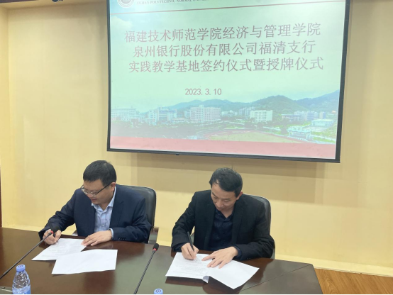陈为洪行长和杨建辉院长分别代表泉州银行福清支行和学院签订校企合作协议,并授“实践基地”牌匾。