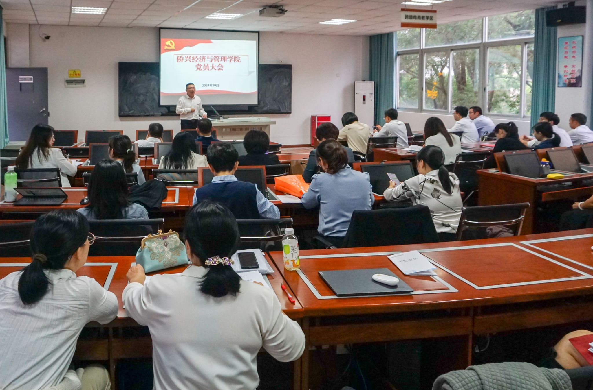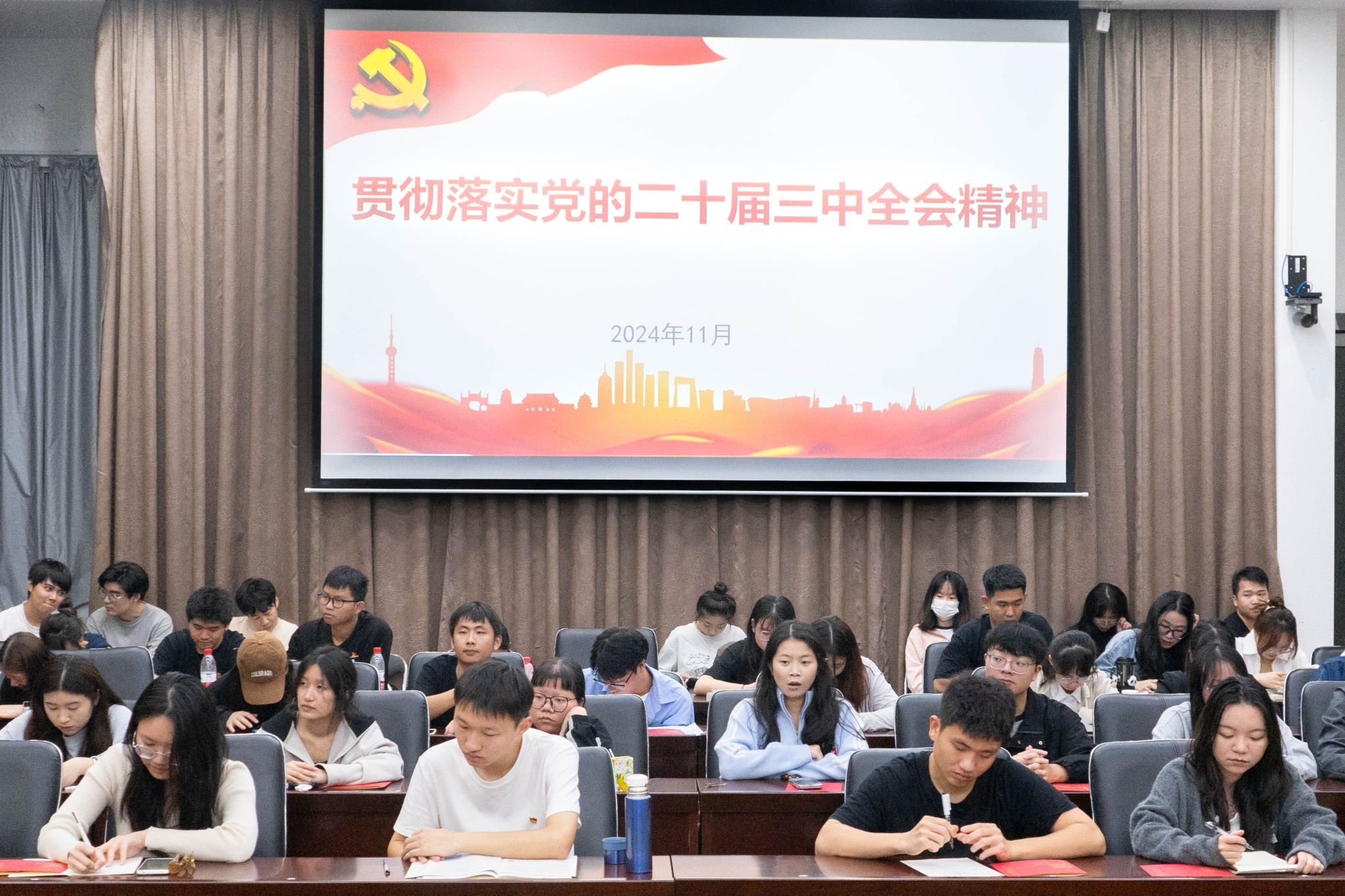 院党委副书记(主持工作)林伟以《贯彻落实党的二十届三中全会精神》为题,为全院学生党员宣讲党的二十届三中全会精神,他要求全体学生党员立足时代、立足未来、立足自身,强化党性修养、优化专业思维、学会竞争合作,敢拼会赢、敢于担当,努力成长为一名卓越的“经”“YING”人才,在强国建设、民族复兴伟大征程中挺膺担当。