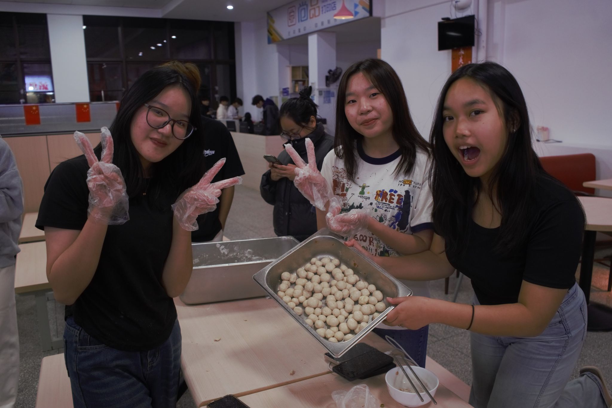 老师、同学们洗手挽袖,大展身手,有的揉面、有的搓汤圆、有的包饺子……动作或娴熟或生疏,引起了阵阵欢声笑语。