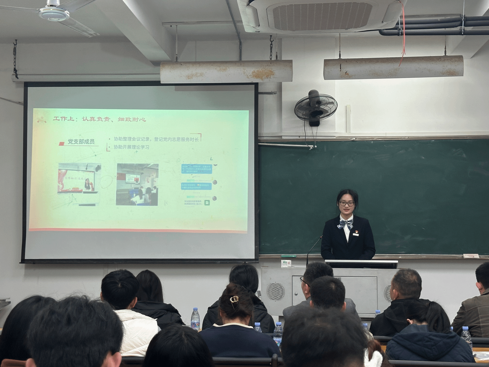 学生第五党支部的陈宇欣等9位预备党员以ppt展示的方式,详实汇报了预备期间的思想、学习、工作、生活等方面的表现,展示了所取得的成绩,汇报了一年来的成长历程。汇报结束后,各党支部书记针对预备党员的表现进行了现场提问。