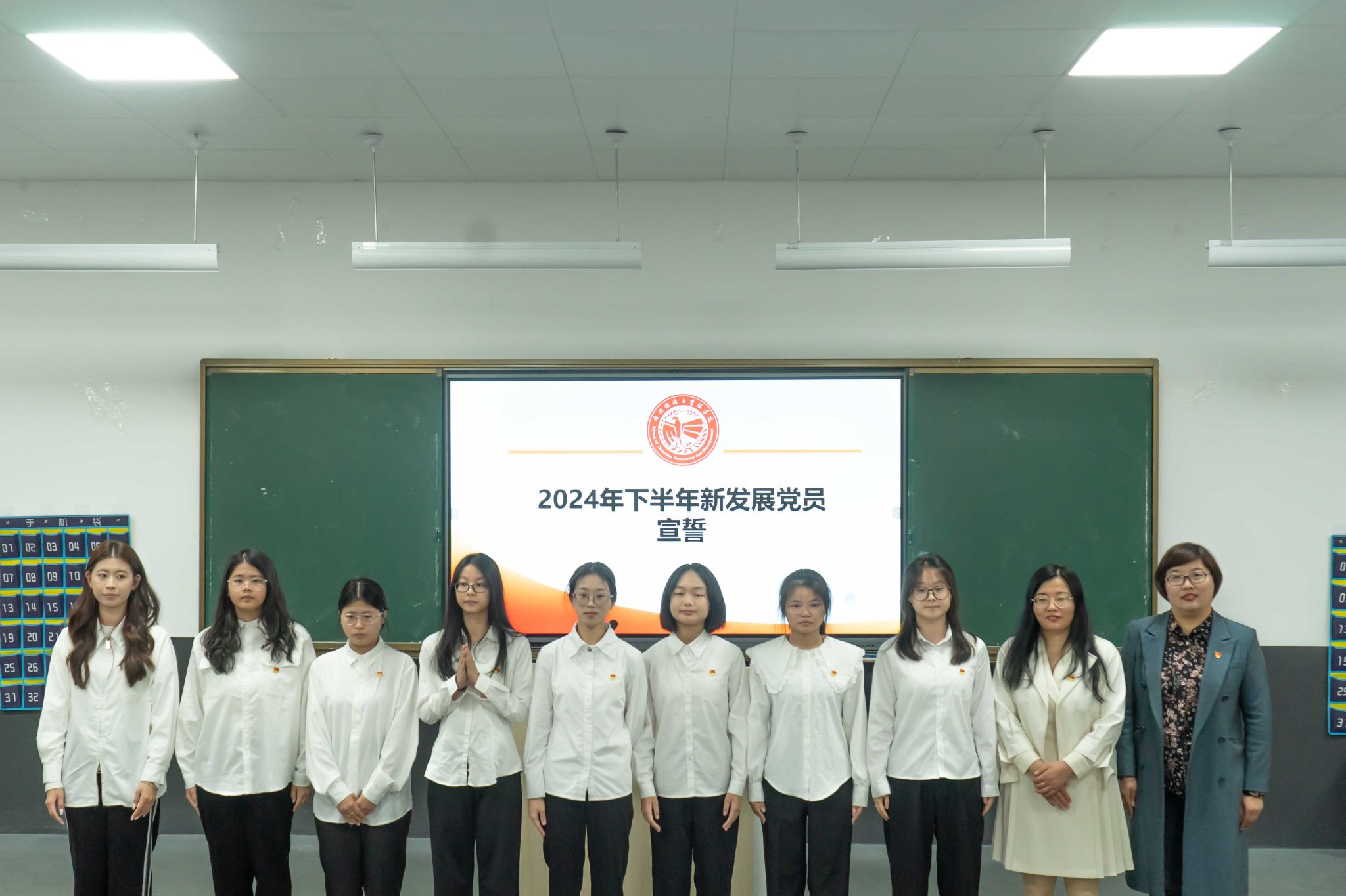 院党委组织员李燕娜宣读了2024年下半年新发展学生党员名单。学院党委委员杭桂兰、金融国贸专业教工党支部书记赵桂燕为新发展学生党员佩戴了党员徽章。