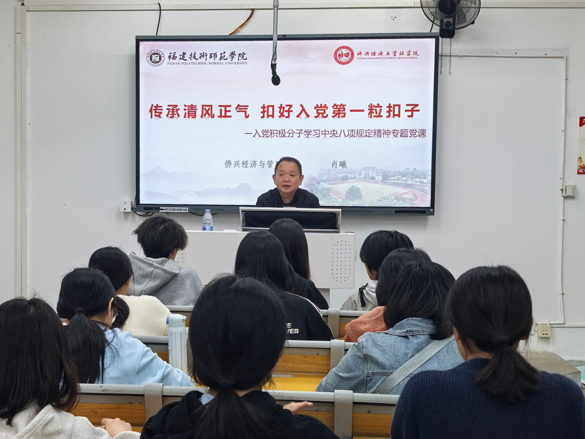 4月25日晚,学院党委副书记肖曦以《传承清风正气 扣好入党第一粒扣子》为题,紧扣住中央八项规定精神的精神实质和丰富内涵,向学院青年学子讲解了中央八项规定由来,并希望学院青年大学生要进一步坚定理想信念,汲取思想伟力,砥砺实干笃行,挺膺担当青春责任。