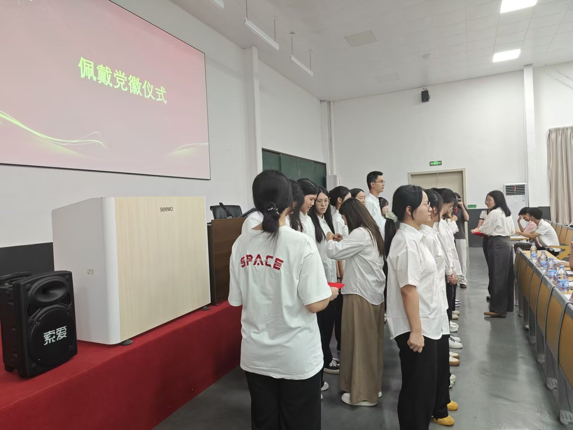 院党委副书记、纪委书记肖曦全程监誓。宣誓仪式后,2025级本科辅导员王亚苹、2022级本科辅导员吴芳芳等2位老师为新党员佩戴党员徽章。
