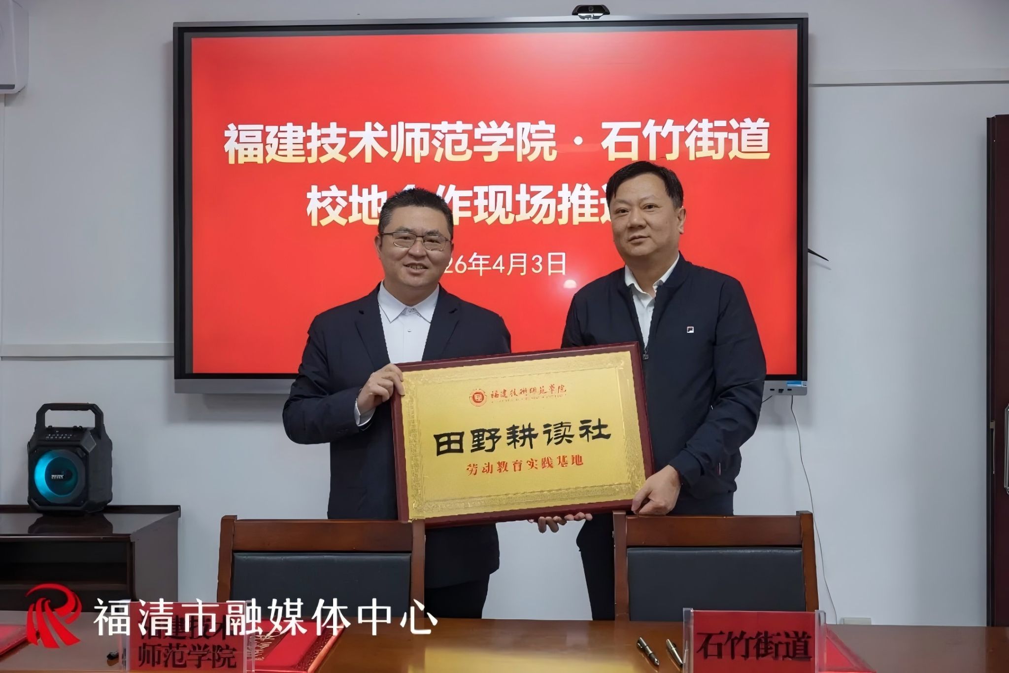 仪式现场,学院党委副书记(主持工作)林伟同石竹街道党工委书记方贤伟共同签署了劳动教育实践基地校地共建协议。随后,双方共同为“福建技术师范学院田野耕读社劳动教育实践基地”授牌。