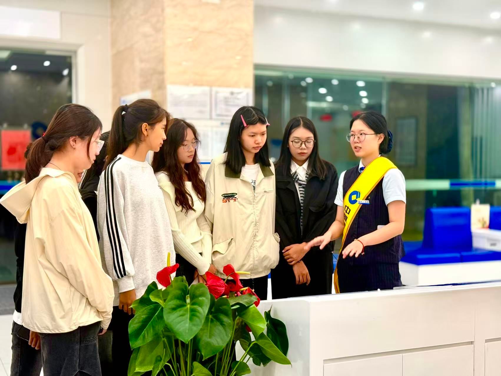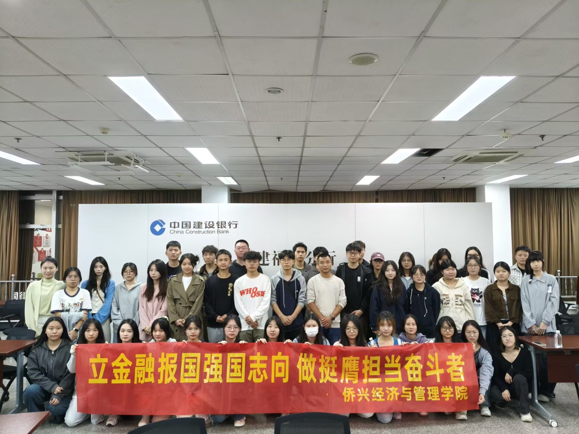 建行工作人员带领同学们参观了建行现代化办公区与营业大厅,系统介绍了银行各岗位职责与能力要求,直观展示了银行的日常运营、部门职能。