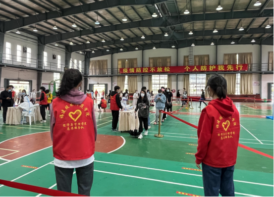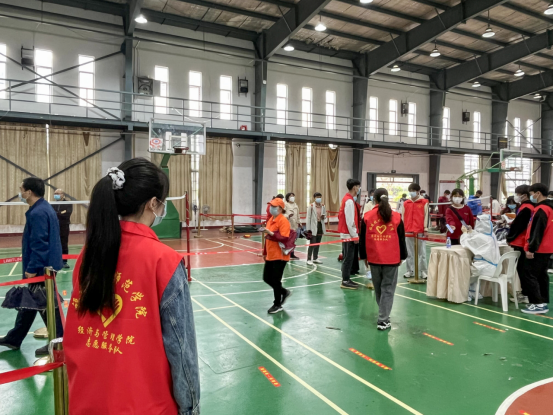 4月20日,在校体育馆核酸检测现场,我院大学生志愿者们身穿红马甲有条不紊的开展着各项工作。他们有的维持核酸检测队伍秩序,提醒大家前后间隔1米距离,有的帮助医务工作者核验核酸检测码,有的引导特殊人群进入绿色通道,帮助师生尽快完成核酸检测。