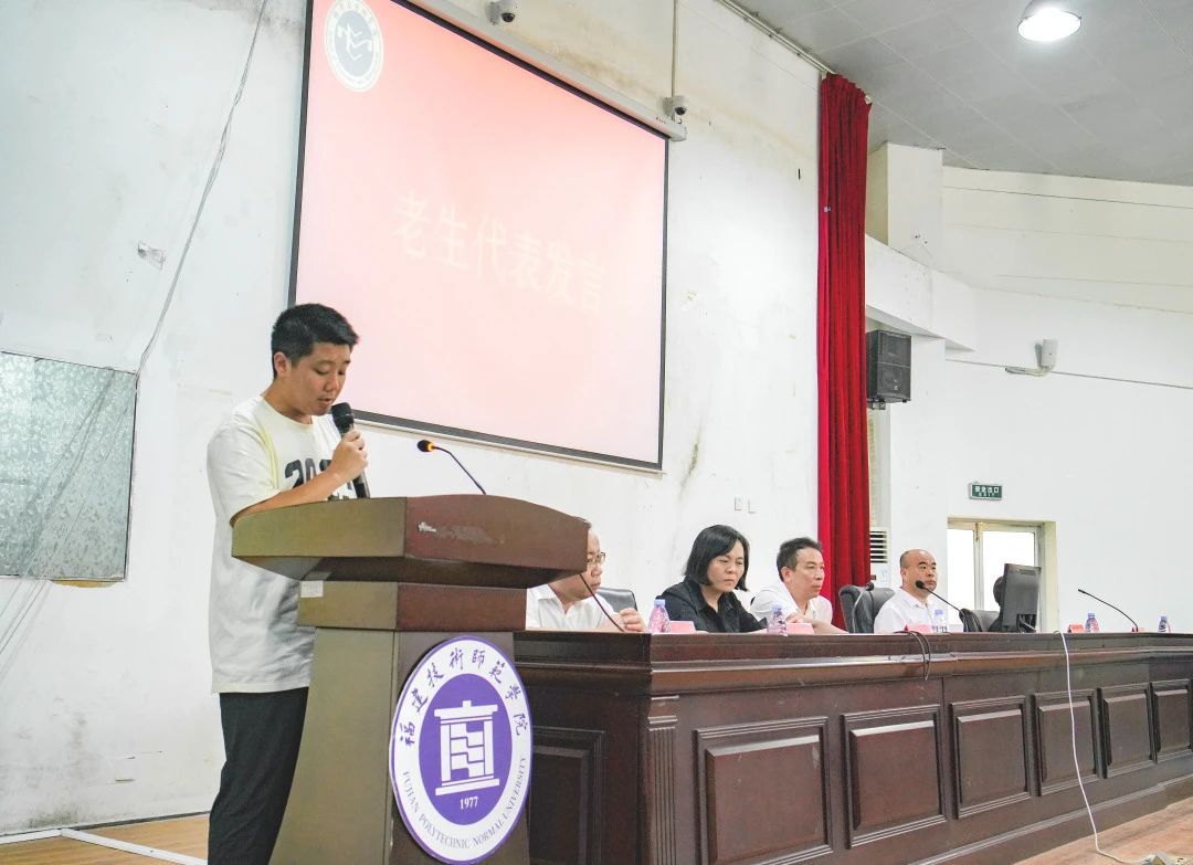 2022级市场营销(专升本)的蔡沄舟同学作为老生代表发言,他与新生们分享了他的大学体会:守信念、志存高远;立大志、明大德、成大才、担大任;力行至善,发奋图强。