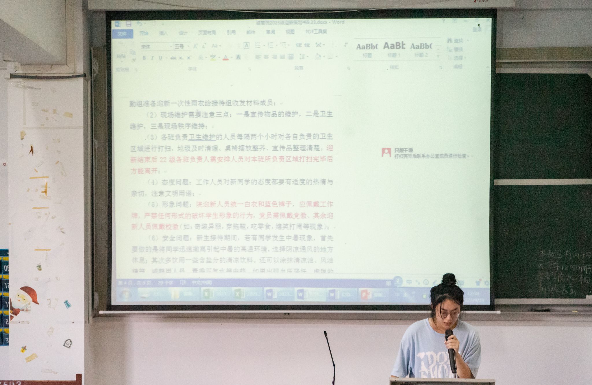 团学办公室干事苏晗琪同学详细介绍了本次迎新工作的前期准备、人员安排、物料保障,迎新当天的分工情况、工作内容和注意事项,以及迎接结束的后期安排,详细梳理了迎新工作的各项安排。团委学生会权益部副部长邱素平同学介绍了志愿服务时长的相关事宜。