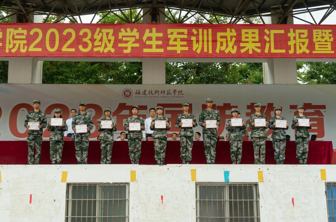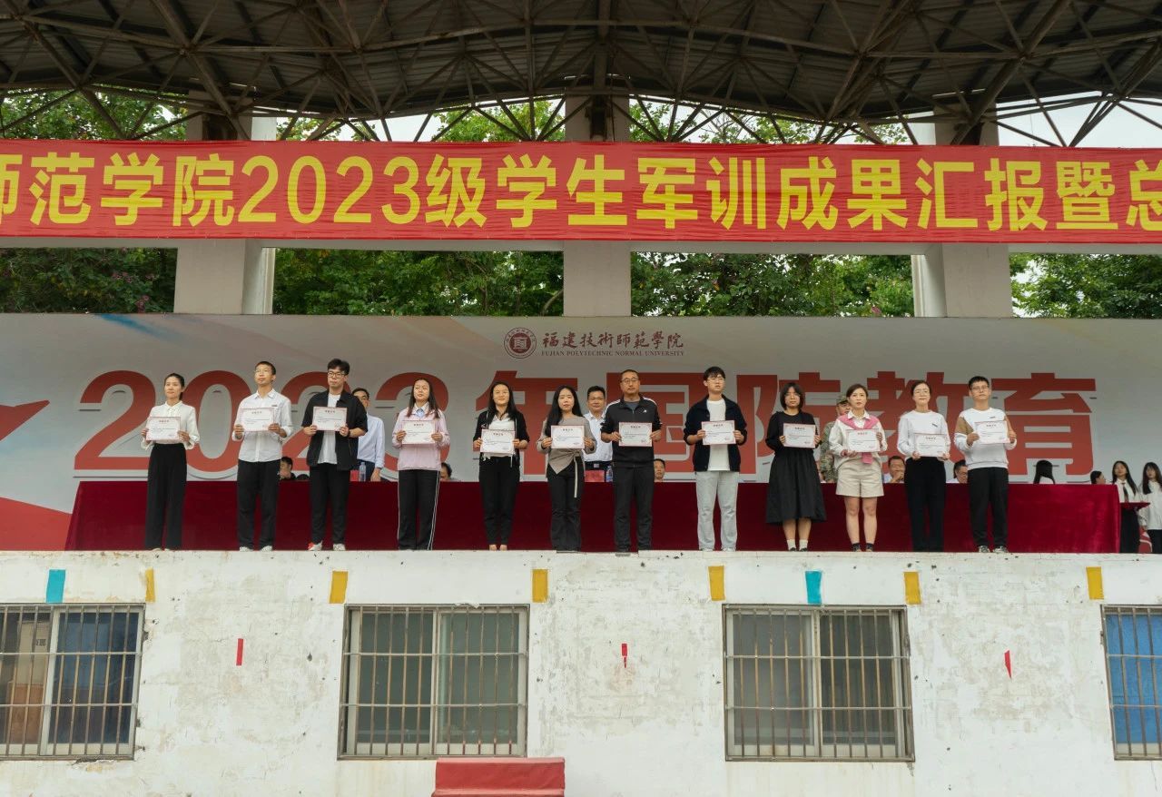 校党委林海峰副书记宣读2023级学生军训表彰决定,我院新生辅导员杨丹老师获得“优秀指导员”荣誉称号,5个排的25名同学获得“优秀学员”称号,51排和54排被评为先进集体。校领导、部队领导为先进集体和个人代表颁发了奖状。