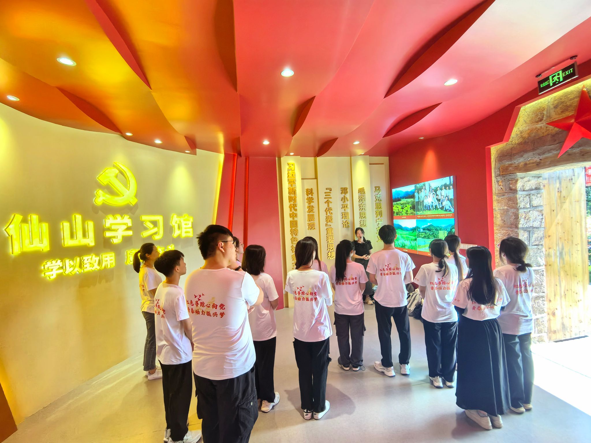 屏南仙山牧场是福建省“习近平新时代中国特色社会主义思想实践示范基地”。在讲解员的带领下,实践队员们参观了仙山学习馆,馆内共有“守正厅”、“启新厅”及“笃行厅”三个主题学习展厅。通过一幅幅历史图片、一份份文献资料,队员们重温了习近平总书记当年在仙山举办宁德地委学习中心组读书班的情景,实地感受当年习近平总书记首创中心组学习进基层的生动实践、探索摆脱贫困途径的务实作风。