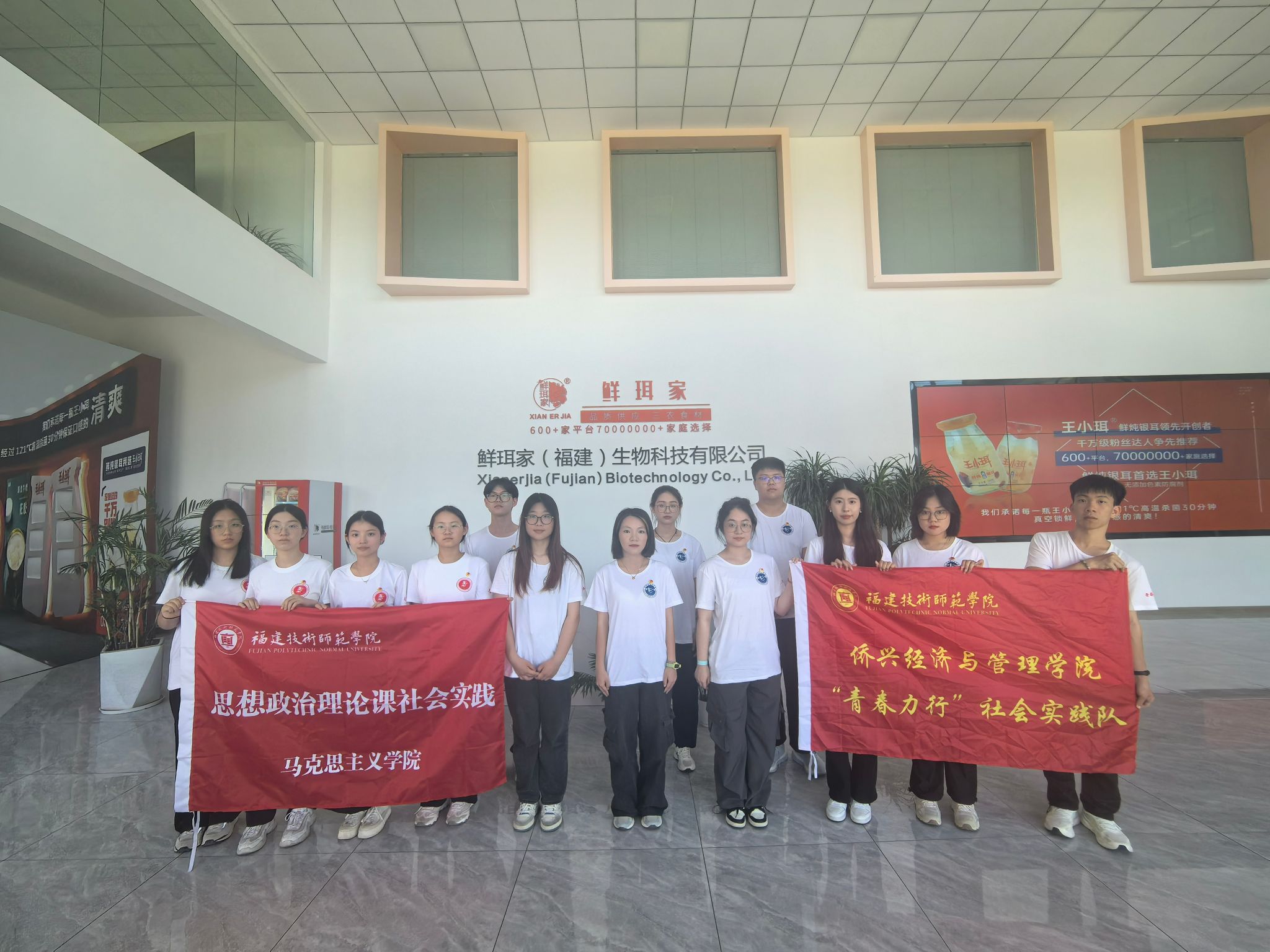 成立于2015年的鲜珥家(福建)生物科技有限公司,是一家集农产品研发、生产及销售于一体的新零售贸易型公司。实践队师生们参观了鲜珥家的包装车间以及直播场所,深入了解产品外包流程与旗下相关产品的详细情况。通过实地学习,将经管类专业知识与实践相结合,了解当地现代化企业在推进乡村振兴中的重要作用。