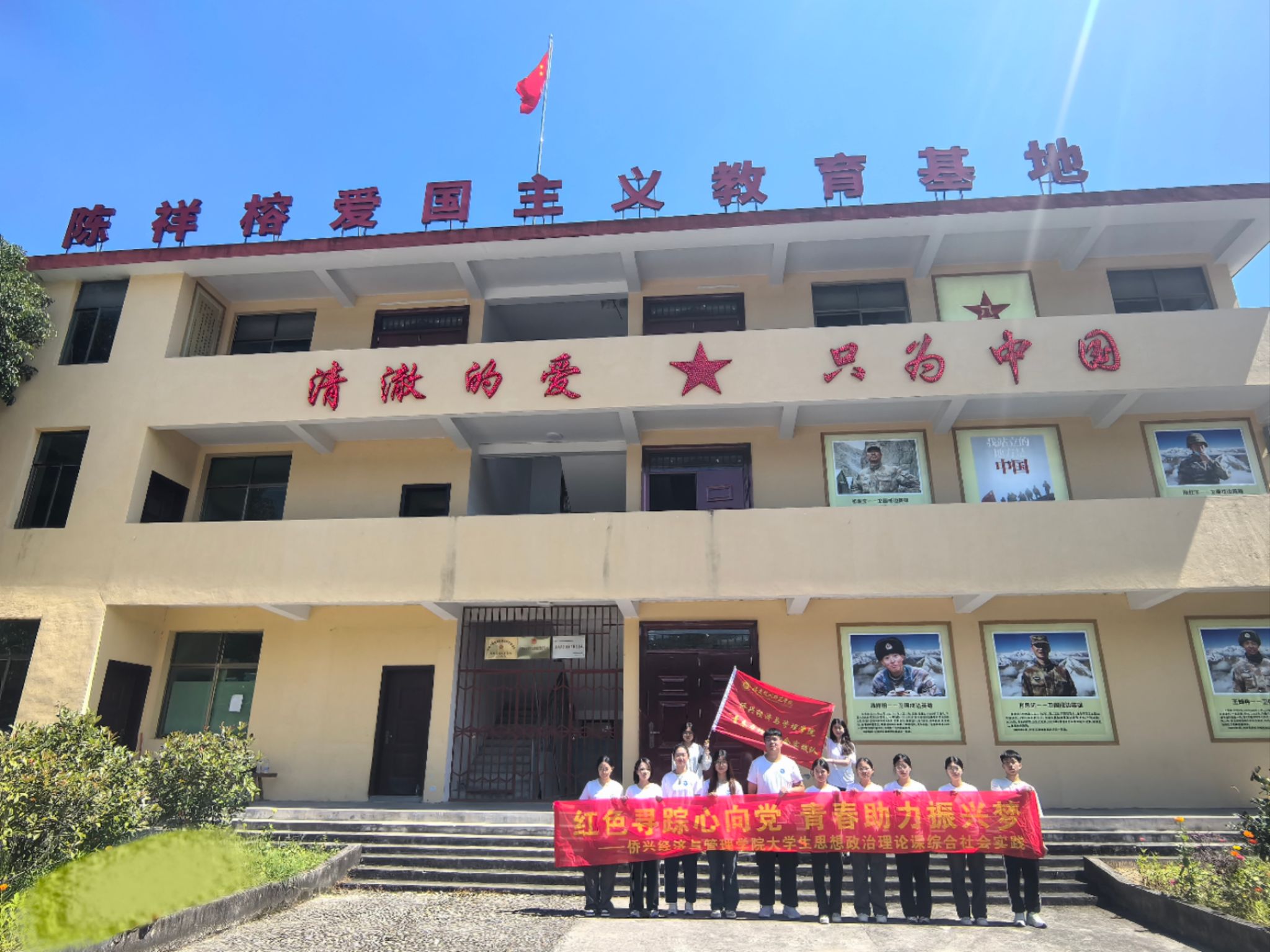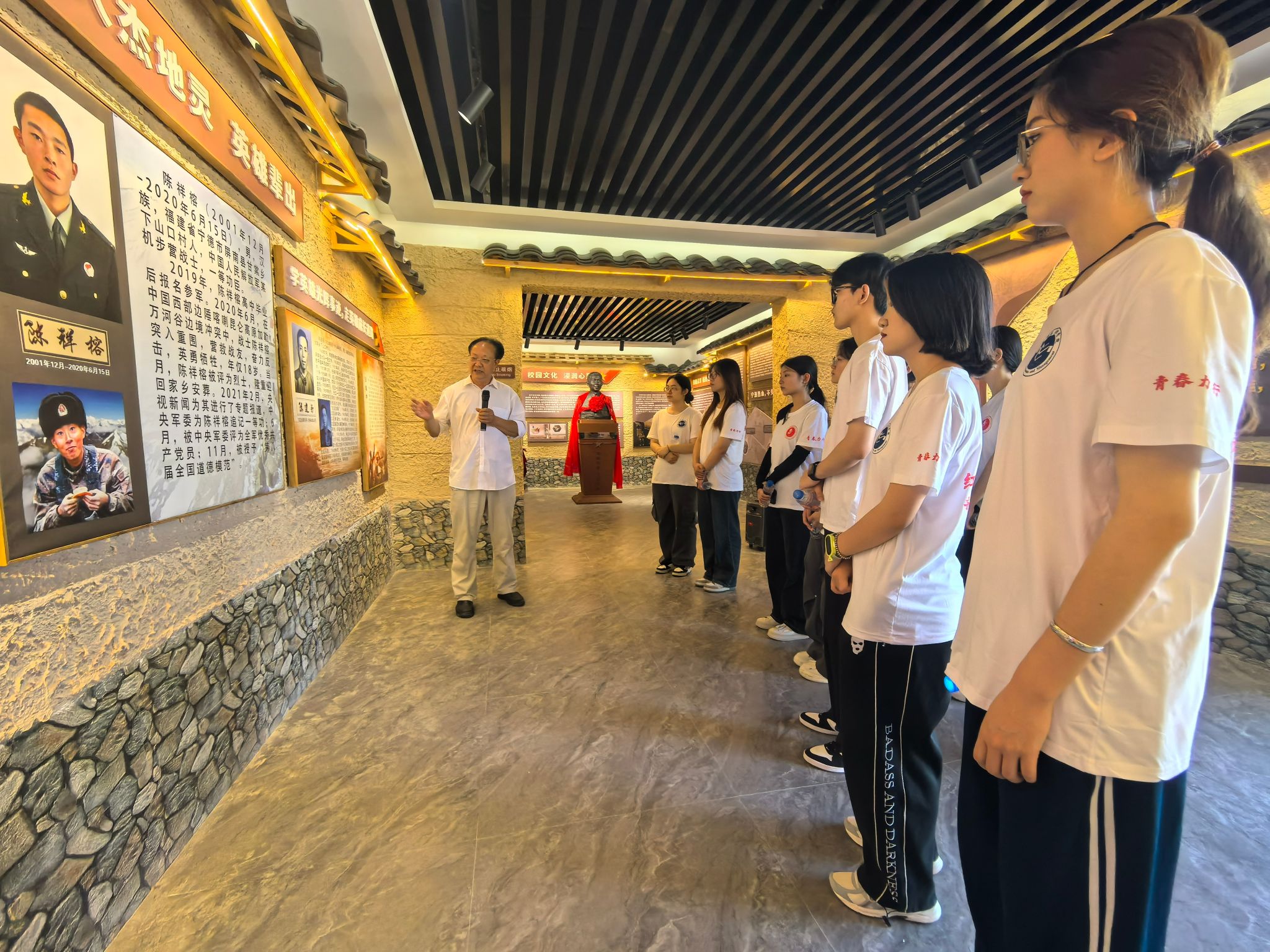 实践队一行来到位于下山口村的陈祥榕爱国主义教育基地。基地负责人陆道生从“人杰地灵,英雄辈出”“尊老爱幼,传承美德”“勇毅从军,报效祖国”“宁洒热血,不失寸土”四个方面围绕陈祥榕烈士的生平事迹开展了一堂“场馆里的思政课”。队员们被“雪山回荡英雄气,风雪边关写忠诚”的精神深深折服,纷纷表示作为新时代大学生,要将“清澈的爱,只为中国”的红色革命文化内涵发扬光大,用自己的实际行动继承和弘扬红色革命精神,成为担当民族复兴大任的时代新人。