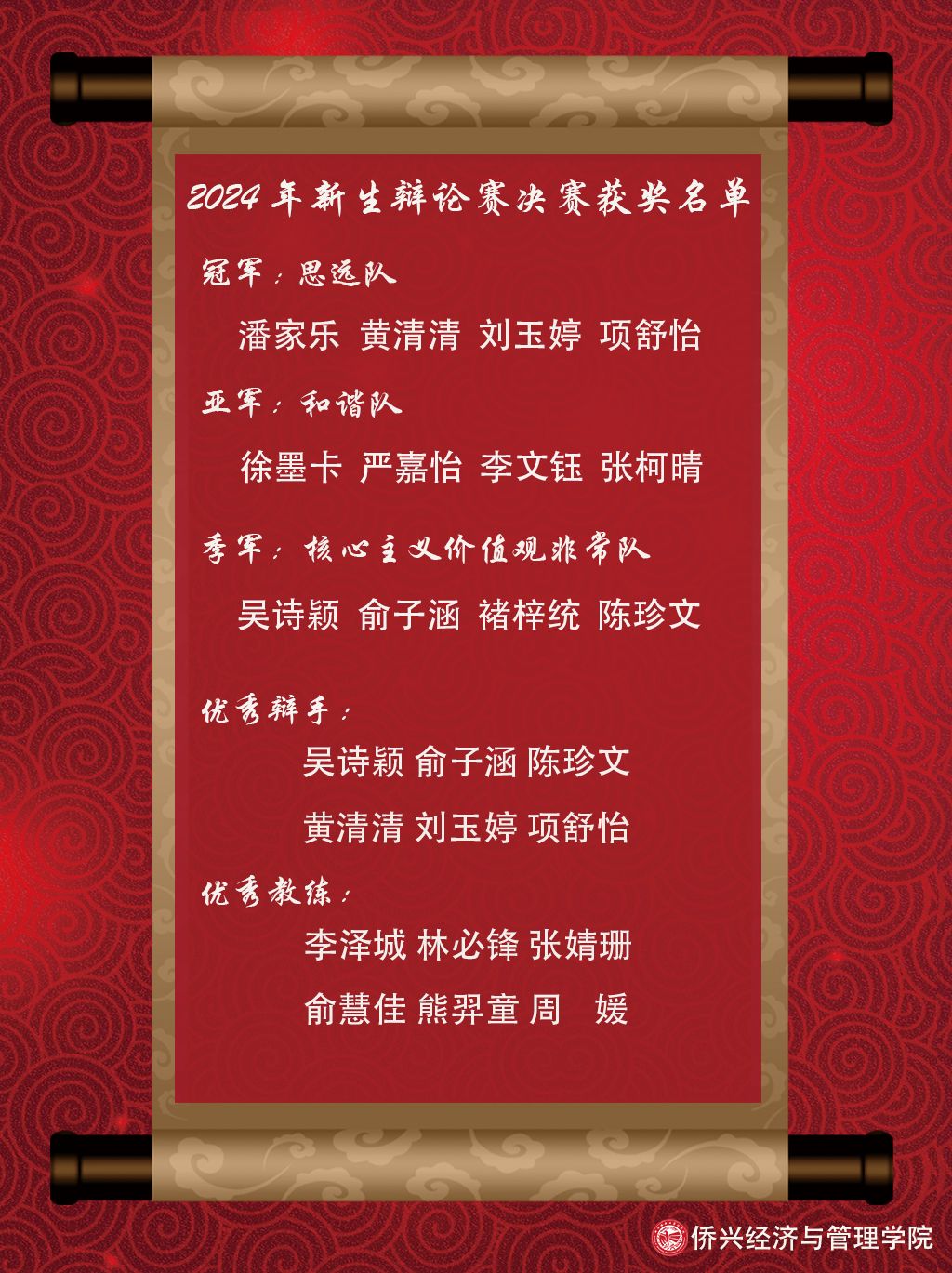 10月16日晚,我院2024年新生辩论赛决赛在科学楼金泰学术报告厅顺利举行。院党委副书记肖曦及陈婉璇、王钦、王亚苹、柳汉江等4位老师担任评委,院团学干部、各班级代表一同观摩了决赛。