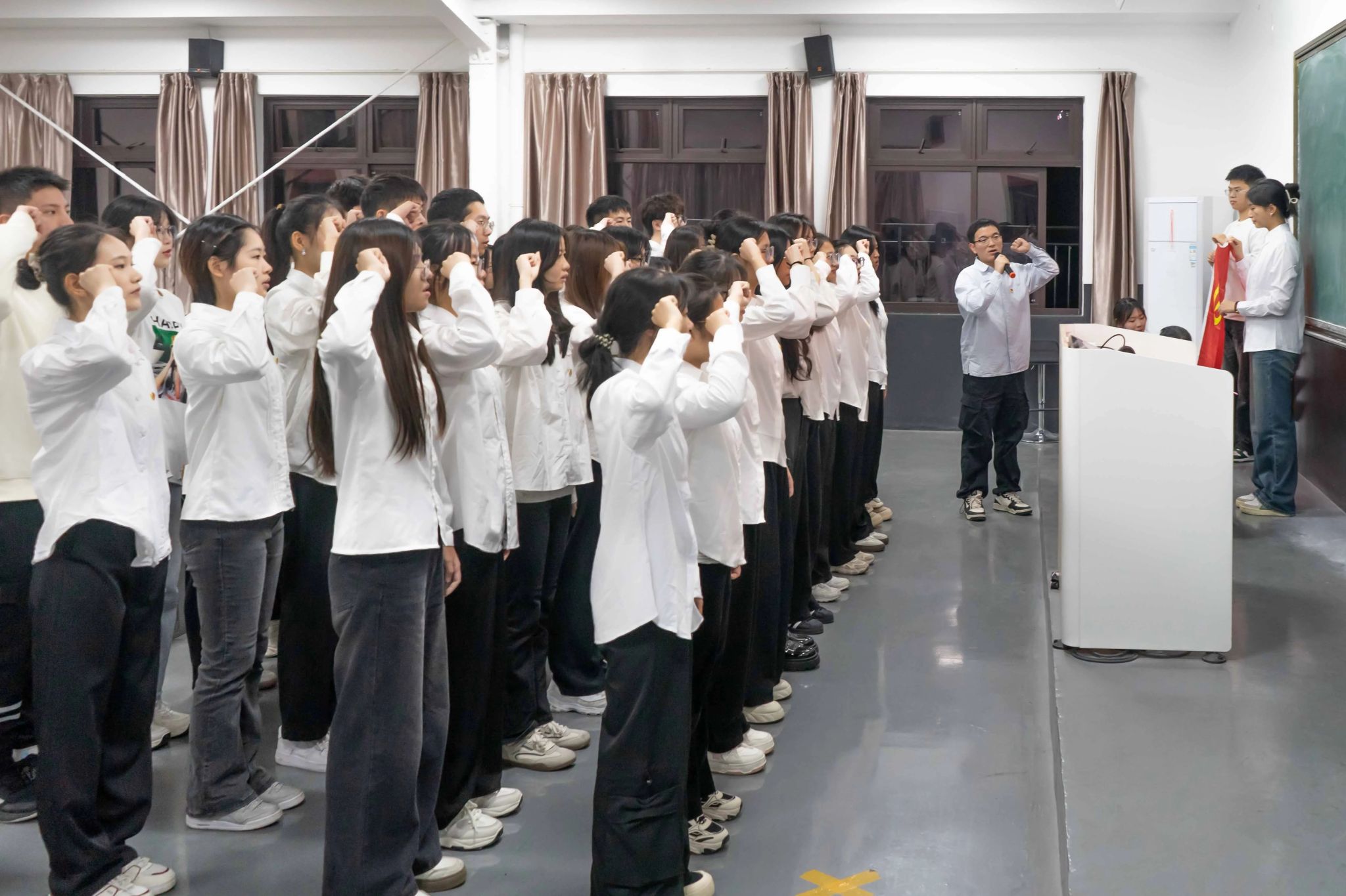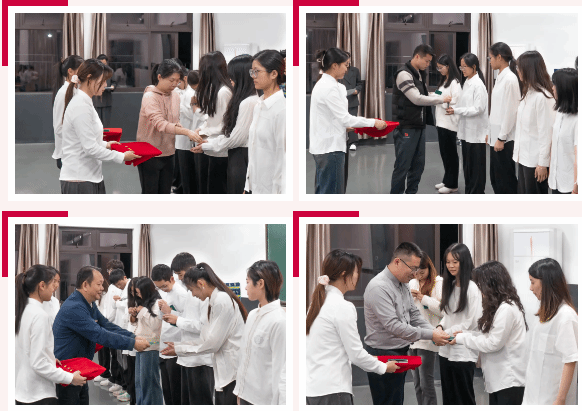 学院领导、辅导员为新发展的41名团员佩戴团徽、颁发团员证。随后,2023级本科辅导员柳汉江带领新团员们进行入团宣誓。