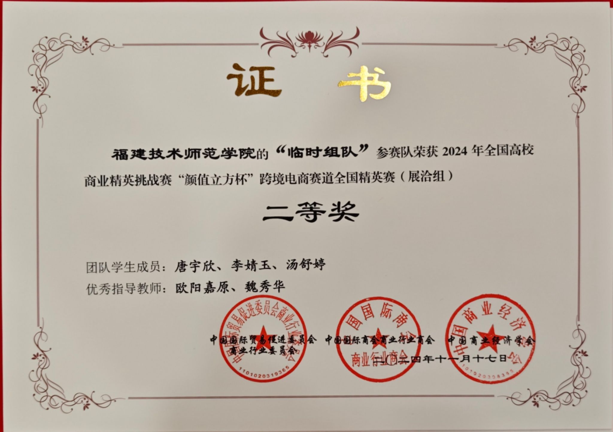 来自2022级国际经济与贸易的唐宇欣、汤舒婷、李婧玉等3位同学组成赛队,在指导老师欧阳嘉原、魏秀华的指导下,荣获2024年全国高校商业精英挑战赛国际贸易竞赛“颜值立方杯”跨境电商赛道全国精英赛精英奖(最高奖项),获跨境电商赛道全国精英赛(展洽组)二等奖。