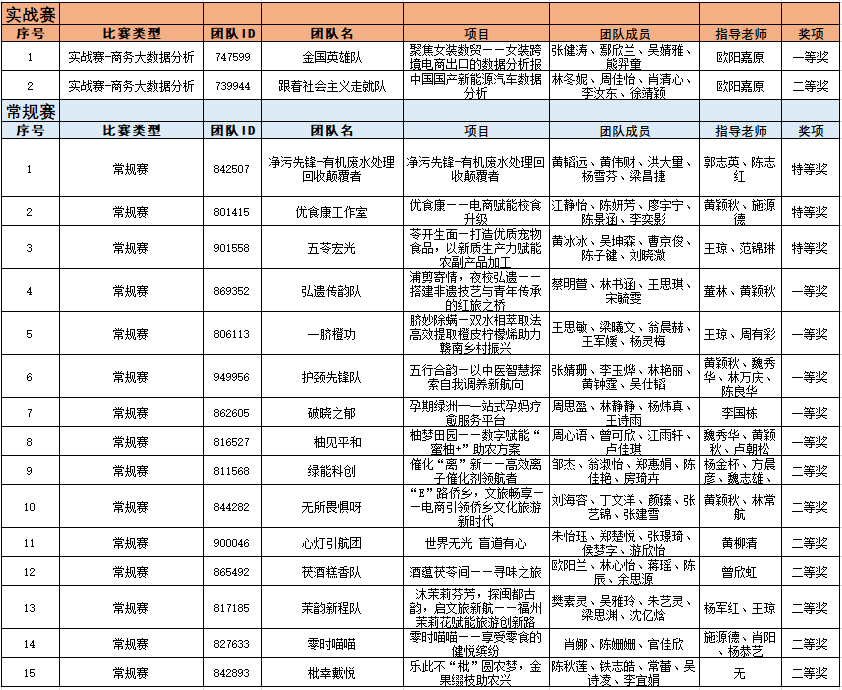 据悉,本次比赛共吸引89支队伍报名常规赛,56支队伍报名实战赛。经过系统合规审查、校赛合规审查、小组筛选等环节,共有22支队伍进入校赛终极赛。本次校赛终极赛共评选出常规赛特等奖3名、一等奖5名、二等奖7名,实战赛商务大数据分析组一等奖1名、二等奖1名。
