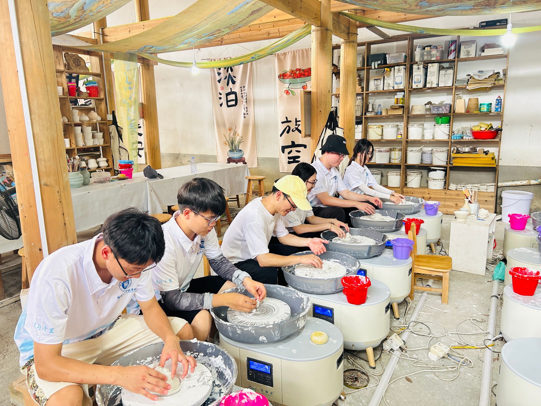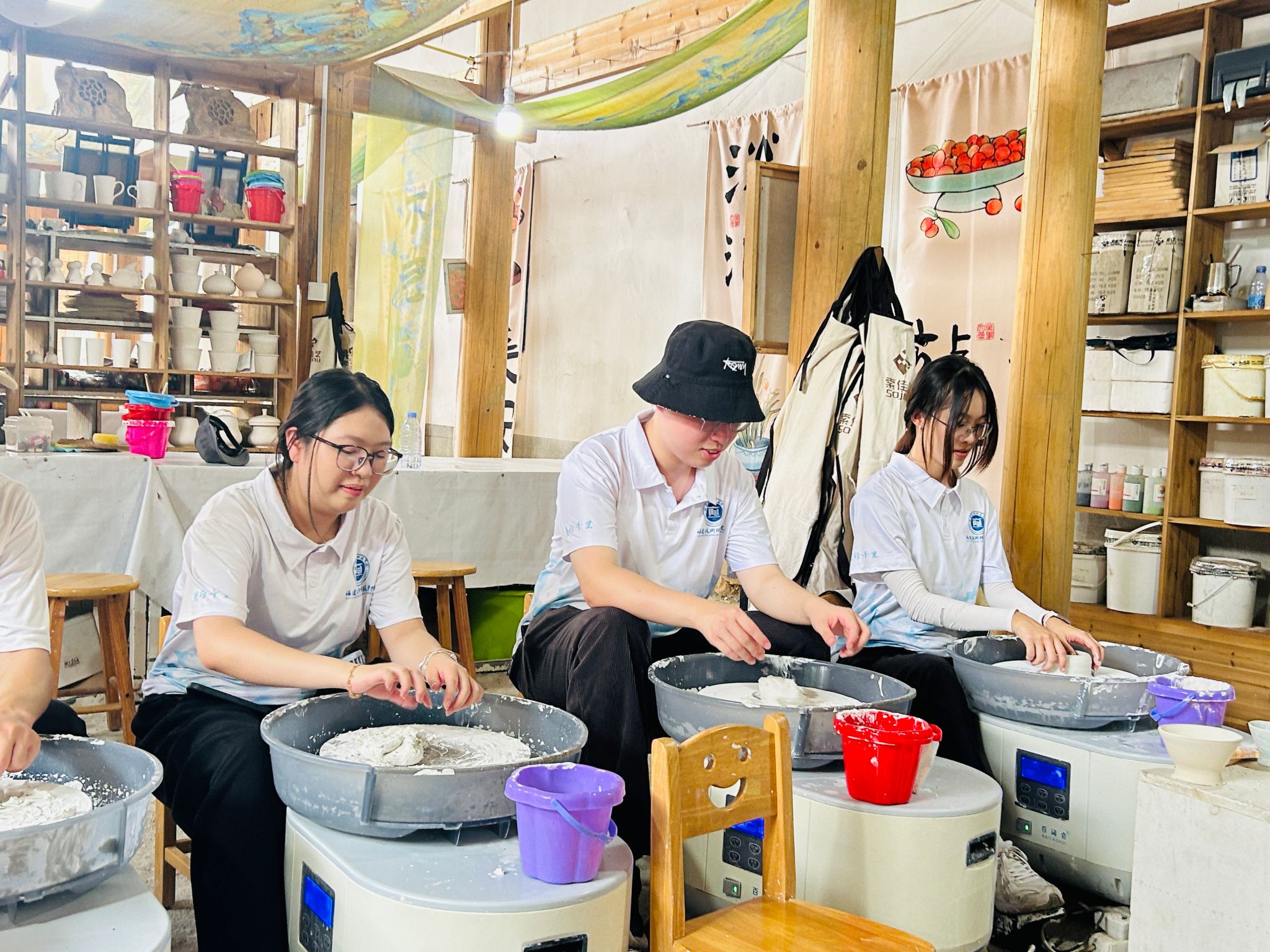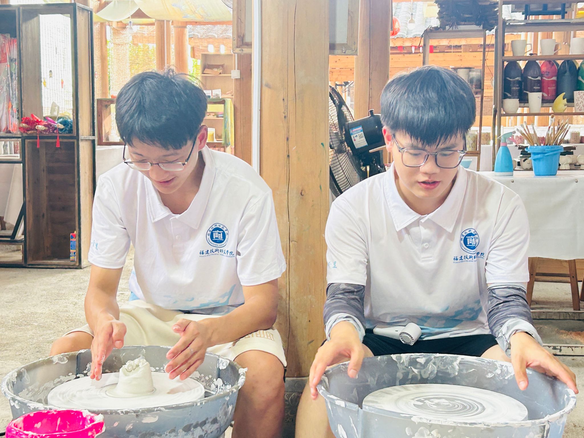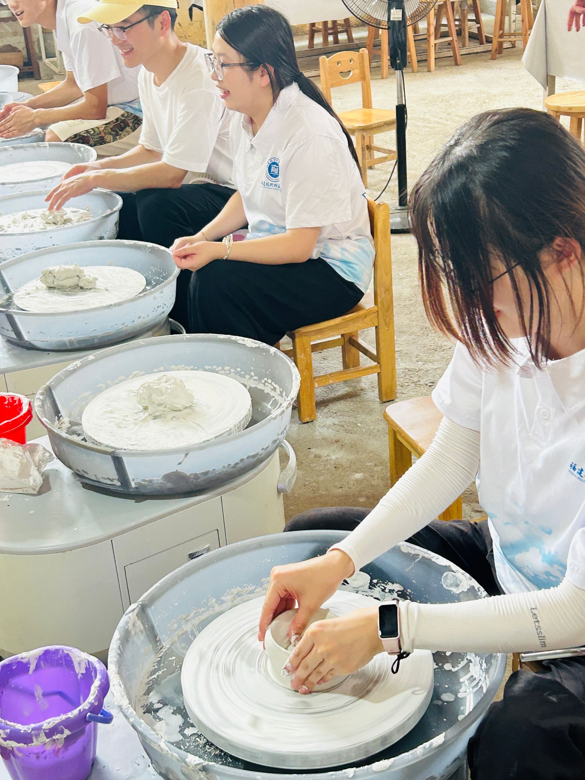 实践队队员在闽清义窑非遗传承馆内,在非遗传承人刘榕冰老师的指导,经揉泥、拉坯、修坯,把瓷泥变为各式雏形,体悟制瓷工艺精妙。